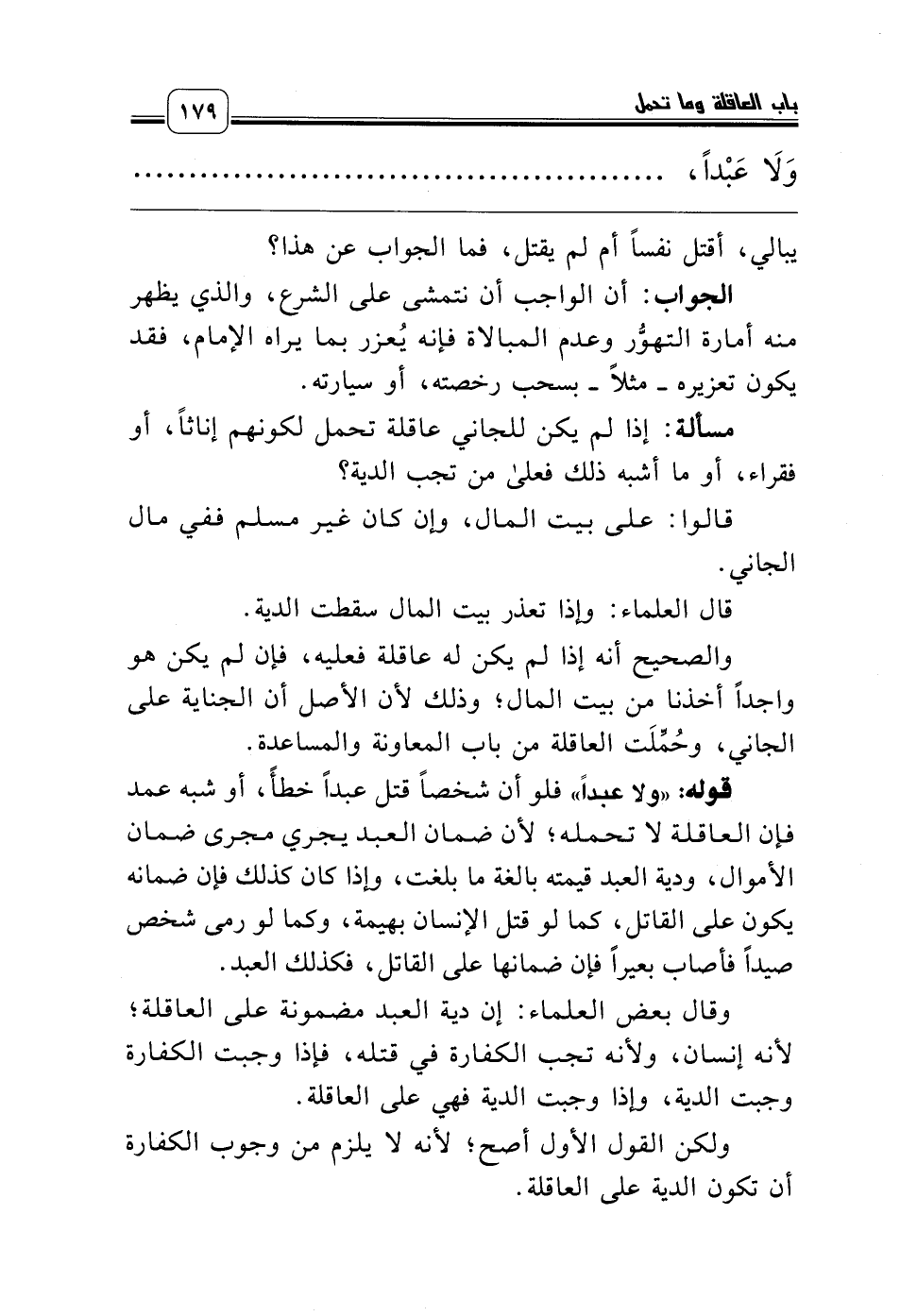 قوله: «ولا عبداً» فلو أن شخصاً قتل عبداً خطأً، أو شبه عمد فإن العاقلة لا تحمله؛ لأن ضمان العبد يجري مجرى ضمان الأموال، ودية العبد قيمته بالغة ما بلغت، وإذا كان كذلك فإن ضمانه يكون على القاتل، كما لو قتل الإنسان بهيمة، وكما لو رمى شخص صيداً فأصاب بعيراً فإن ضمانها على القاتل، فكذلك العبد.