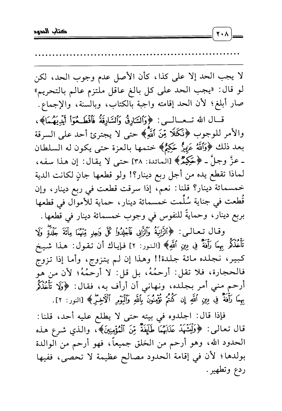 قال الله تعالى: {وَالسَّارِقُ وَالسَّارِقَةُ فَاقْطَعُوا أَيدِيَهُمَا}، والأمر للوجوب {نَكَالاً مِنَ اللَّهِ} حتى لا يجترئ أحد على السرقة بعد ذلك {وَاللَّهُ عَزِيزٌ حَكِيمٌ} ختمها بالعزة حتى يكون له السلطان ـ عزّ وجل ـ {حَكِيمٌ} [المائدة: 38] حتى لا يقال: إن هذا سفه، لماذا تقطع يده من أجل ربع دينار؟! ولو قطعها جانٍ لكانت الدية خمسمائة دينار؟ قلنا: نعم، إذا سرقت قطعت في ربع دينار، وإن قُطعت في جناية سُلِّمت خمسمائة دينار، حماية للأموال في قطعها بربع دينار، وحمايةً للنفوس في وجوب خمسمائة دينار في قطعها.