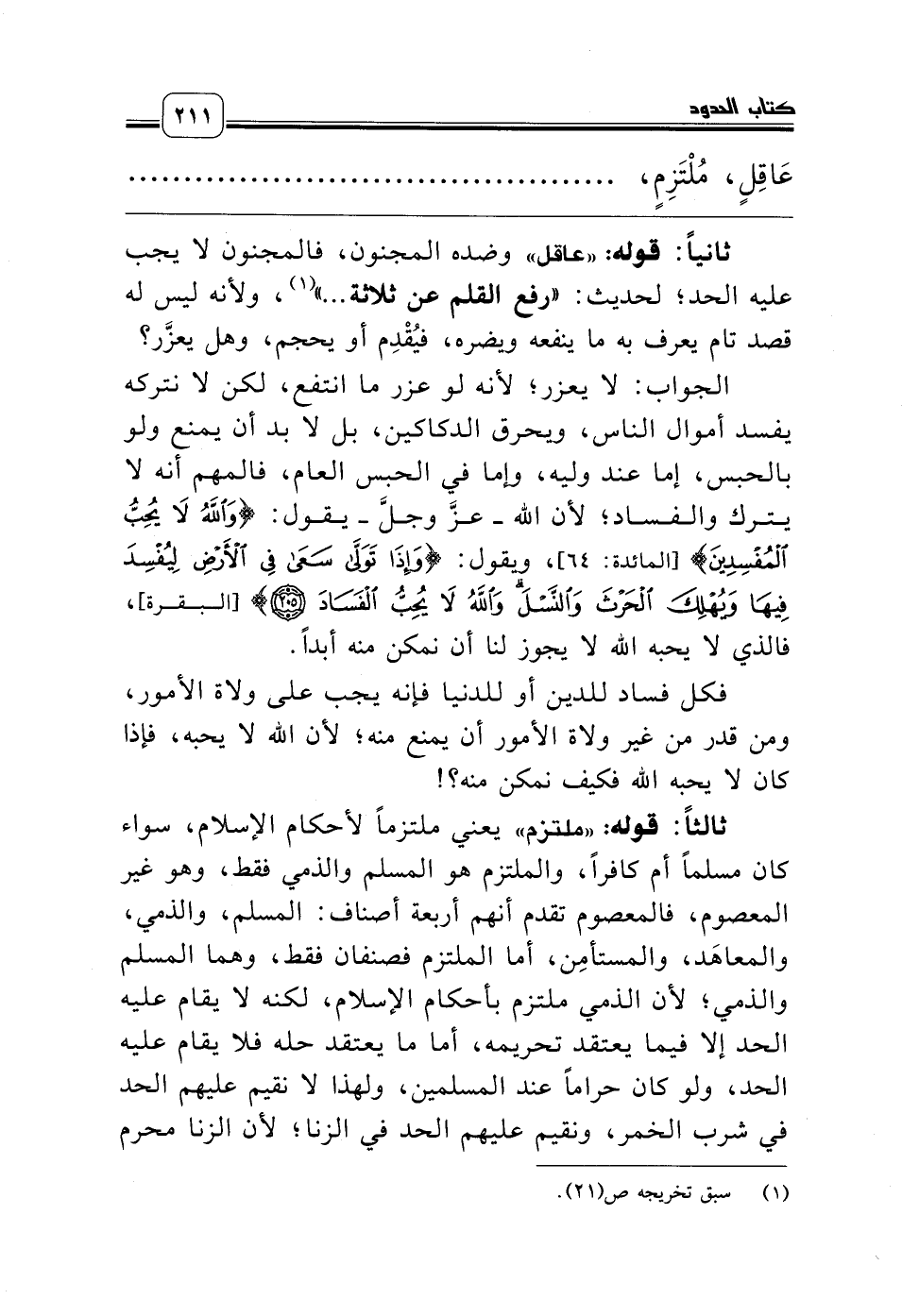 ثالثاً: قوله: «ملتزم» يعني ملتزماً لأحكام الإسلام، سواء كان مسلماً أم كافراً، والملتزم هو المسلم والذمي فقط، وهو غير المعصوم، فالمعصوم تقدم أنهم أربعة أصناف: المسلم، والذمي، والمعاهَد، والمستأمِن، أما الملتزم فصنفان فقط، وهما المسلم والذمي؛ لأن الذمي ملتزم بأحكام الإسلام، لكنه لا يقام عليه الحد إلا فيما يعتقد تحريمه، أما ما يعتقد حله فلا يقام عليه الحد، ولو كان حراماً عند المسلمين، ولهذا لا نقيم عليهم الحد في شرب الخمر، ونقيم عليهم الحد في الزنا؛ لأن الزنا محرم