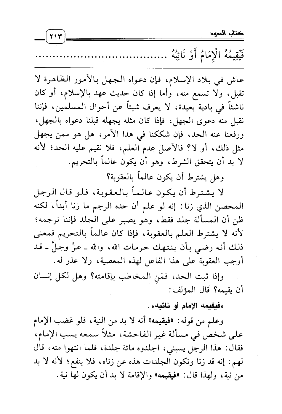 وعلم من قوله: «فيقيمه» أنه لا بد من النية، فلو غضب الإمام على شخص في مسألة غير الفاحشة، مثلاً سمعه يسب الإمام، فقال: هذا الرجل يسبني، اجلدوه مائة جلدة، فلما انتهوا منه، قال لهم: إنه قد زنا وتكون الجلدات هذه عن زناه، فلا ينفع؛ لأنه لا بد من نية، ولهذا قال: «فيقيمه» والإقامة لا بد أن يكون لها نية.