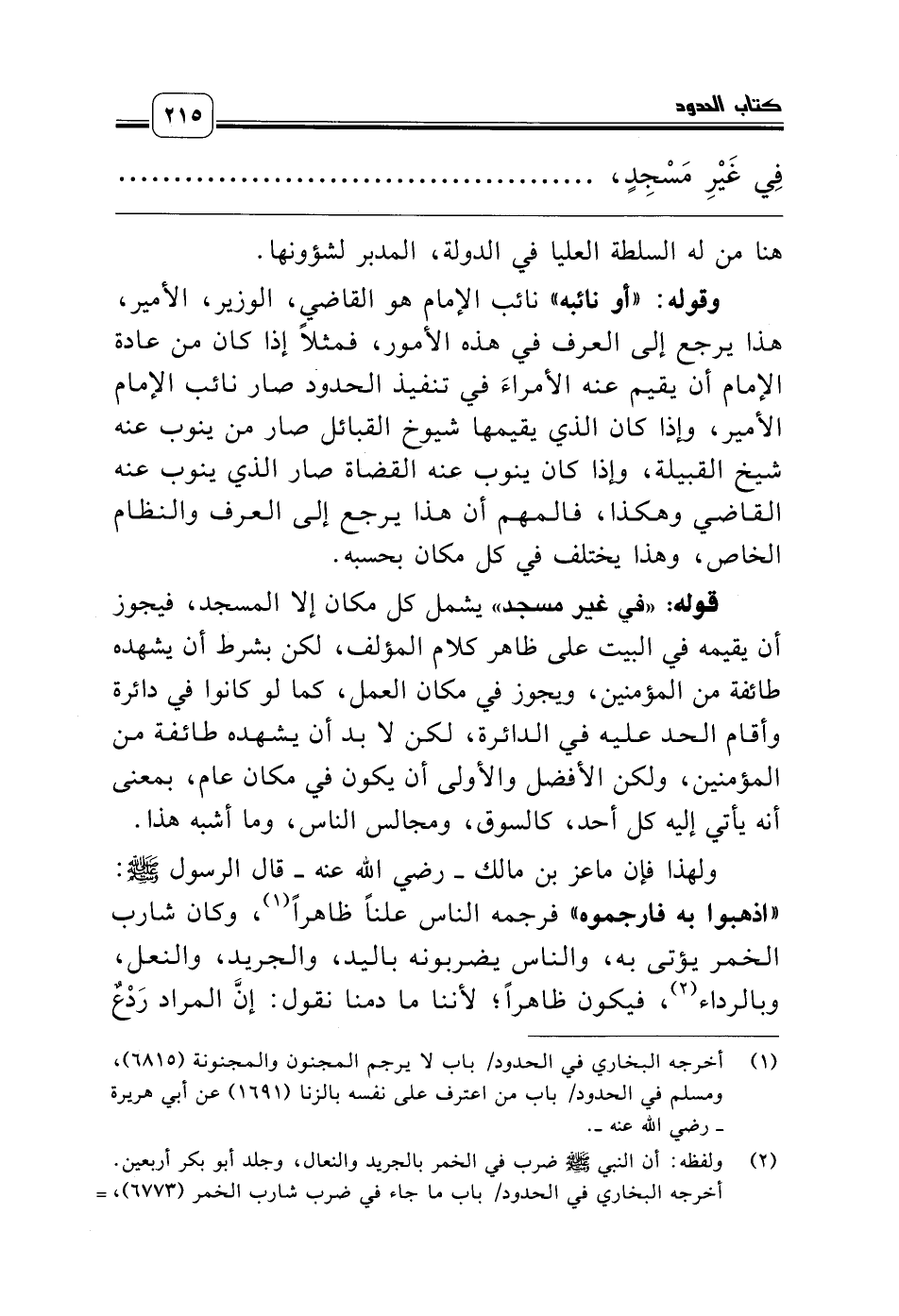 وقوله: «أو نائبه» نائب الإمام هو القاضي، الوزير، الأمير، هذا يرجع إلى العرف في هذه الأمور، فمثلاً إذا كان من عادة الإمام أن يقيم عنه الأمراءَ في تنفيذ الحدود صار نائب الإمام الأمير، وإذا كان الذي يقيمها شيوخ القبائل صار من ينوب عنه شيخ القبيلة، وإذا كان ينوب عنه القضاة صار الذي ينوب عنه القاضي وهكذا، فالمهم أن هذا يرجع إلى العرف والنظام الخاص، وهذا يختلف في كل مكان بحسبه.