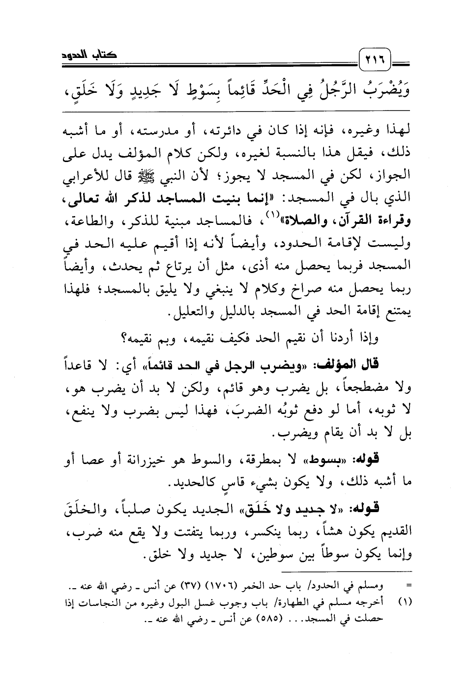 لهذا وغيره، فإنه إذا كان في دائرته، أو مدرسته، أو ما أشبه ذلك، فيقل هذا بالنسبة لغيره، ولكن كلام المؤلف يدل على الجواز، لكن في المسجد لا يجوز؛ لأن النبي صلّى الله عليه وسلّم قال للأعرابي الذي بال في المسجد: «إنما بنيت المساجد لذكر الله تعالى، وقراءة القرآن، والصلاة» (¬1)، فالمساجد مبنية للذكر، والطاعة، وليست لإقامة الحدود، وأيضاً لأنه إذا أقيم عليه الحد في المسجد فربما يحصل منه أذى، مثل أن يرتاع ثم يحدث، وأيضاً ربما يحصل منه صراخ وكلام لا ينبغي ولا يليق بالمسجد؛ فلهذا يمتنع إقامة الحد في المسجد بالدليل والتعليل.
