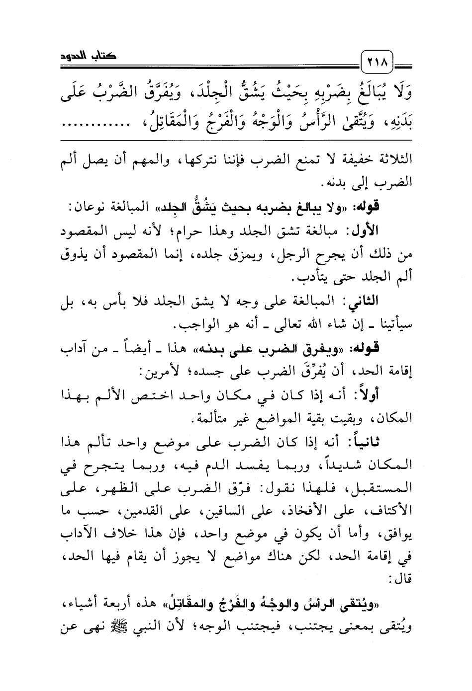 ثانياً: أنه إذا كان الضرب على موضع واحد تألم هذا المكان شديداً، وربما يفسد الدم فيه، وربما يتجرح في المستقبل، فلهذا نقول: فرّق الضرب على الظهر، على الأكتاف، على الأفخاذ، على الساقين، على القدمين، حسب ما يوافق، وأما أن يكون في موضع واحد، فإن هذا خلاف الآداب في إقامة الحد، لكن هناك مواضع لا يجوز أن يقام فيها الحد، قال: