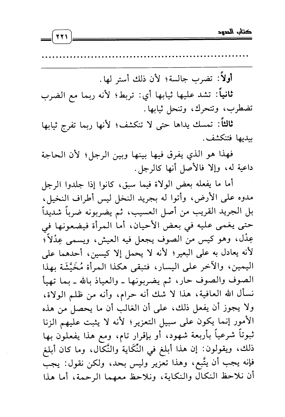 أما ما يفعله بعض الولاة فيما سبق، كانوا إذا جلدوا الرجل مدوه على الأرض، وأتوا له بجريد النخل ليس أطراف النخيل، بل الجريد القريب من أصل العسيب، ثم يضربونه ضرباً شديداً حتى يغمى عليه في بعض الأحيان، أما المرأة فيضعونها في عِدْل، وهو كيس من الصوف يجعل فيه العيش، ويسمى عِدْلاً؛ لأنه يعادل به على البعير؛ لأنه لا يحمل إلا كيسين، أحدهما على اليمين، والآخر على اليسار، فتبقى هكذا المرأة مُخَيَّشَة بهذا الصوف والصوف حار، ثم يضربونها ـ والعياذ بالله ـ بما تهيأ نسأل الله العافية، هذا لا شك أنه حرام، وأنه من ظلم الولاة، ولا يجوز أن يفعل ذلك، على أن الغالب أن ما يحصل من هذه الأمور إنما يكون على سبيل التعزير؛ لأنه لا يثبت عليهم الزنا ثبوتاً شرعياً بأربعة شهود، أو بإقرار تام، ومع هذا يفعلون بها ذلك، ويقولون: إن هذا أبلغ في النِّكَاية والنَّكال، وما كان أبلغ فإنه يجب أن يتَّبع، وهذا تعزير وليس بحد، ولكن نقول: يجب أن نلاحظ النكال والنكاية، ونلاحظ معهما الرحمة، أما هذا