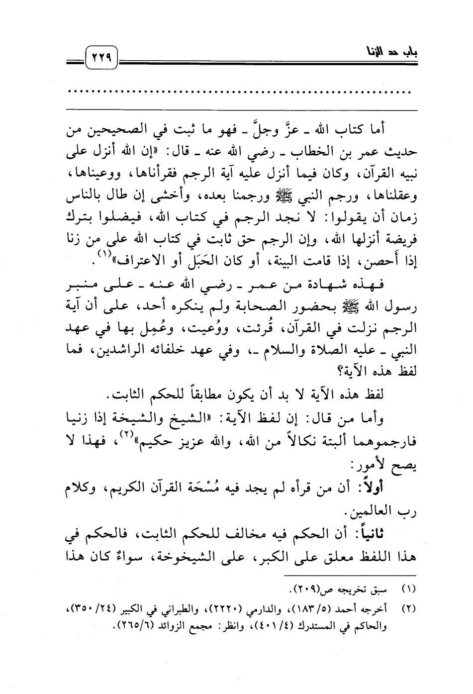 أما كتاب الله ـ عزّ وجل ـ فهو ما ثبت في الصحيحين من حديث عمر بن الخطاب ـ رضي الله عنه ـ قال: «إن الله أنزل على نبيه القرآن، وكان فيما أنزل عليه آية الرجم فقرأناها، ووعيناها، وعقلناها، ورجم النبي صلّى الله عليه وسلّم ورجمنا بعده، وأخشى إن طال بالناس زمان أن يقولوا: لا نجد الرجم في كتاب الله، فيضلوا بترك فريضة أنزلها الله، وإن الرجم حق ثابت في كتاب الله على من زنا إذا أَحصن، إذا قامت البينة، أو كان الحَبَل أو الاعتراف» (¬1).