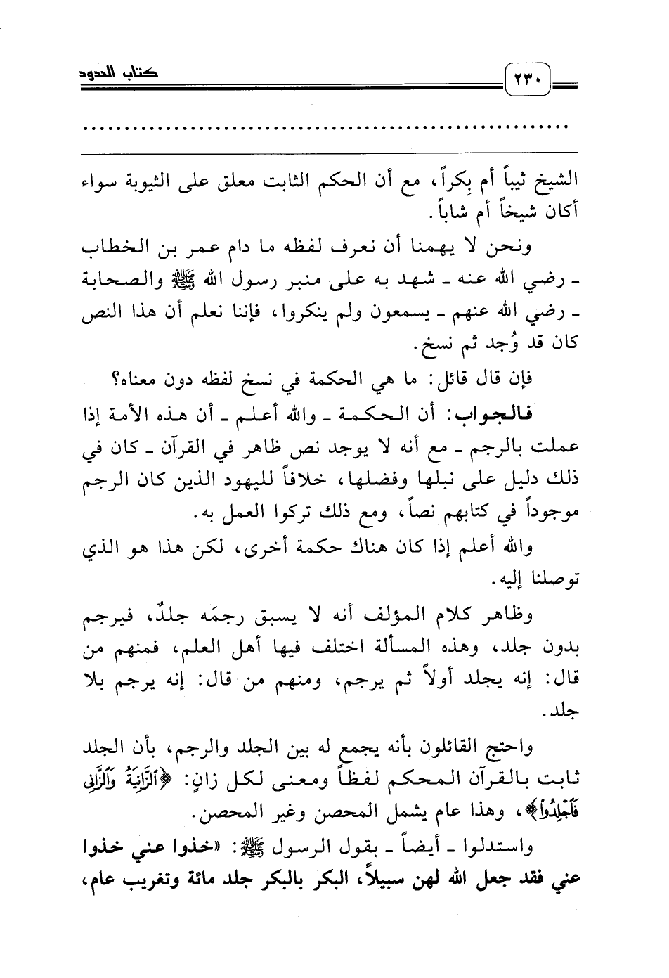 واستدلوا ـ أيضاً ـ بقول الرسول صلّى الله عليه وسلّم: «خذوا عني خذوا عني فقد جعل الله لهن سبيلاً، البكر بالبكر جلد مائة وتغريب عام،