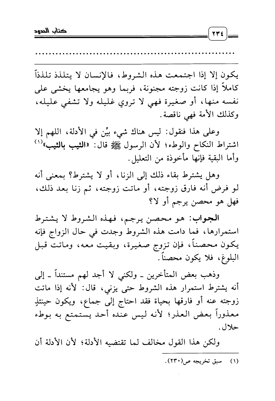 وعلى هذا فنقول: ليس هناك شيء بيِّن في الأدلة، اللهم إلا اشتراط النكاح والوطء؛ لأن الرسول صلّى الله عليه وسلّم قال: «الثيب بالثيب» (¬1) وأما البقية فإنها مأخوذة من التعليل.