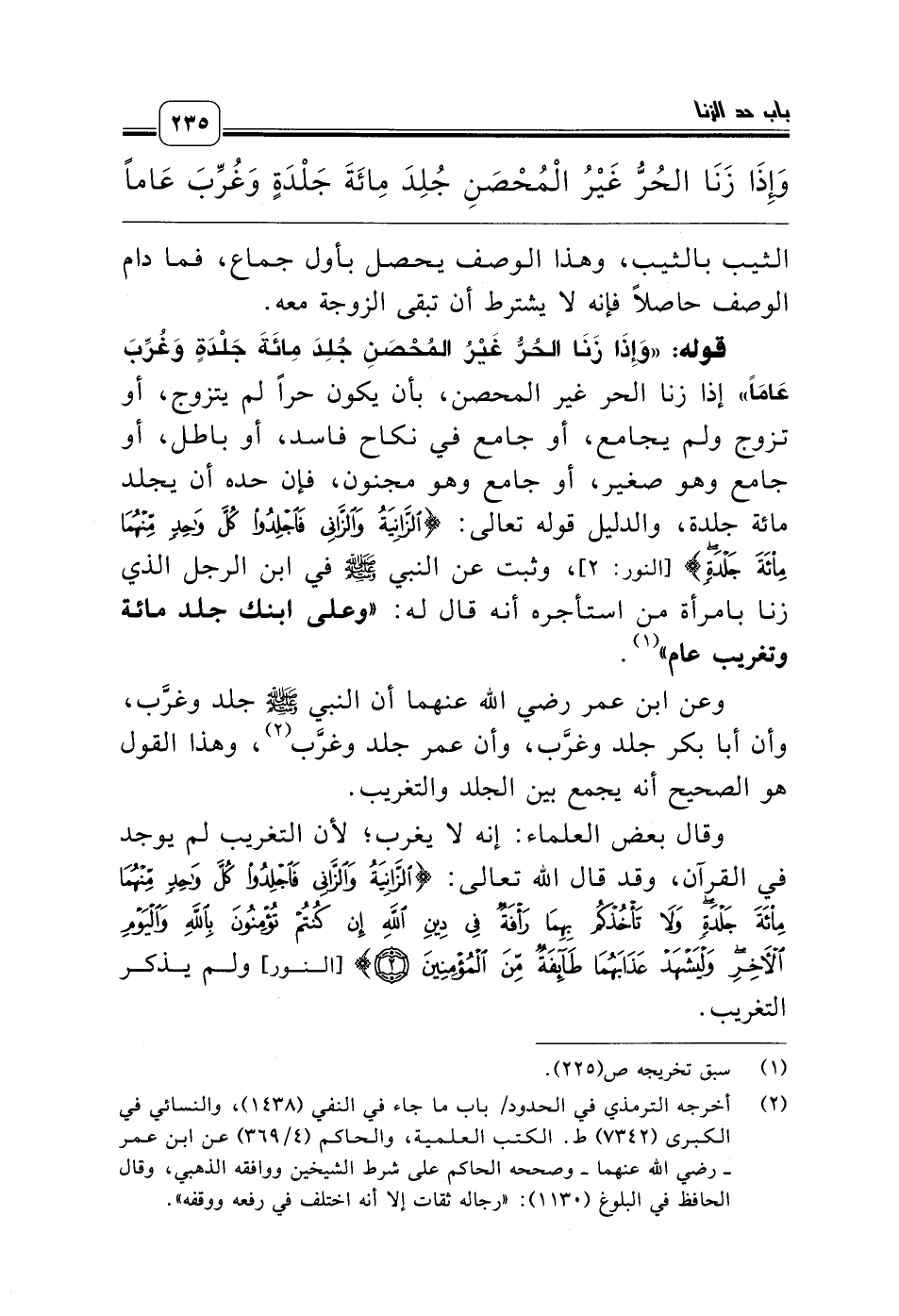قوله: «وَإِذَا زَنَا الحُرُّ غَيْرُ المُحْصَنِ جُلِدَ مِائَةَ جَلْدَةٍ وَغُرِّبَ عَامَاً» إذا زنا الحر غير المحصن، بأن يكون حراً لم يتزوج، أو تزوج ولم يجامع، أو جامع في نكاح فاسد، أو باطل، أو جامع وهو صغير، أو جامع وهو مجنون، فإن حده أن يجلد مائة جلدة، والدليل قوله تعالى: {الزَّانِيَةُ وَالزَّانِي فَاجْلِدُوا كُلَّ وَاحِدٍ مِنْهُمَا مِئَةَ جَلْدَةٍ} [النور: 2]، وثبت عن النبي صلّى الله عليه وسلّم في ابن الرجل الذي زنا بامرأة من استأجره أنه قال له: «وعلى ابنك جلد مائة وتغريب عام» (¬1).