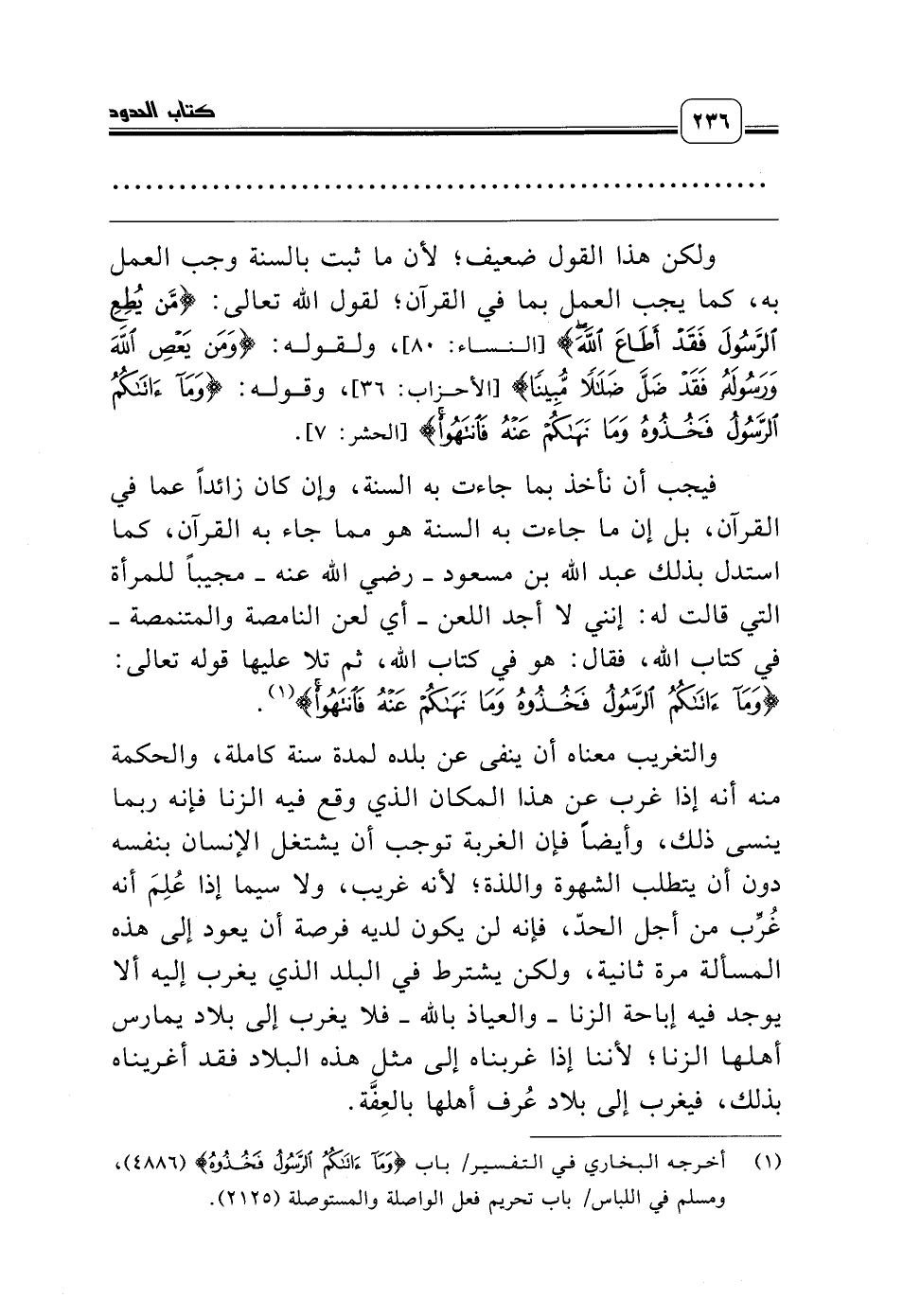 ولكن هذا القول ضعيف؛ لأن ما ثبت بالسنة وجب العمل به، كما يجب العمل بما في القرآن؛ لقول الله تعالى: {مَنْ يُطِعِ الرَّسُولَ فَقَدْ أَطَاعَ اللَّهَ} [النساء: 80]، ولقوله: {وَمَنْ يَعْصِ اللَّهَ وَرَسُولَهُ فَقَدْ ضَلَّ ضَلاَلاً مُبِيناً} [الأحزاب: 36]، وقوله: {وَمَا آتَاكُمُ الرَّسُولُ فَخُذُوهُ وَمَا نَهَاكُمْ عَنْهُ فَانْتَهُوا} [الحشر: 7].