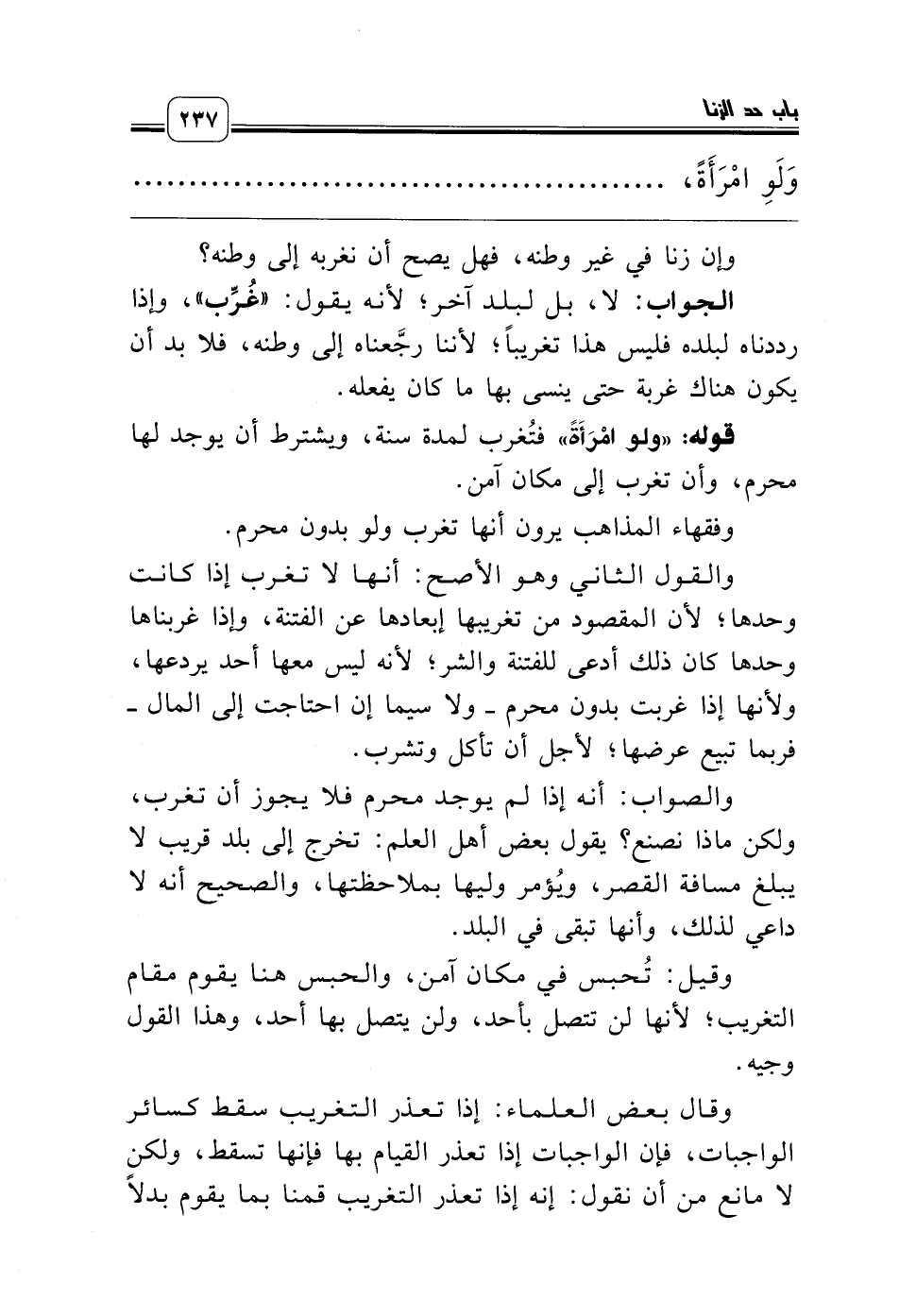 قوله: «ولو امْرَأَةً» فتُغرب لمدة سنة، ويشترط أن يوجد لها محرم، وأن تغرب إلى مكان آمن.