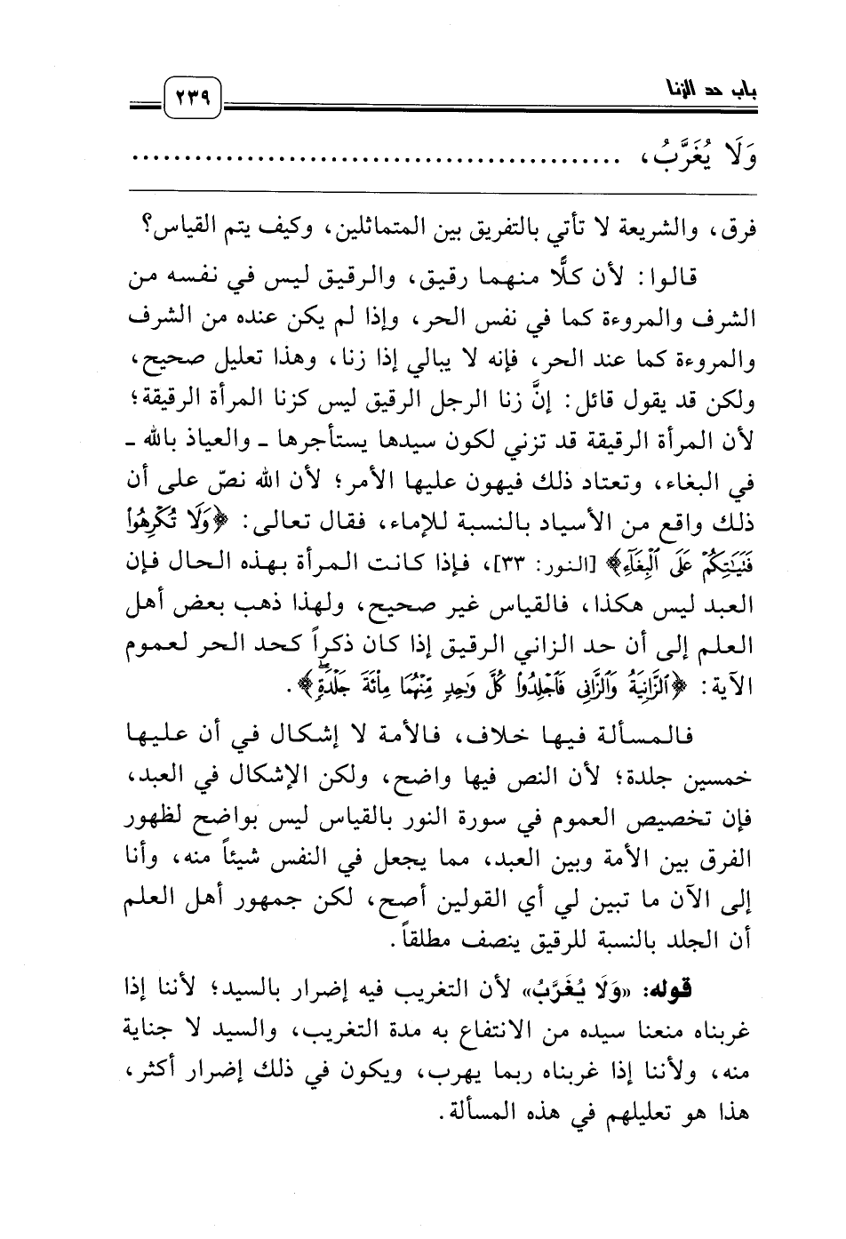قالوا: لأن كلًّا منهما رقيق، والرقيق ليس في نفسه من الشرف والمروءة كما في نفس الحر، وإذا لم يكن عنده من الشرف والمروءة كما عند الحر، فإنه لا يبالي إذا زنا، وهذا تعليل صحيح، ولكن قد يقول قائل: إنَّ زنا الرجل الرقيق ليس كزنا المرأة الرقيقة؛ لأن المرأة الرقيقة قد تزني لكون سيدها يستأجرها ـ والعياذ بالله ـ في البغاء، وتعتاد ذلك فيهون عليها الأمر؛ لأن الله نصّ على أن ذلك واقع من الأسياد بالنسبة للإماء، فقال تعالى: {وَلاَ تُكْرِهُوا فَتَيَاتِكُمْ عَلَى الْبِغَاءِ} [النور: 33]، فإذا كانت المرأة بهذه الحال فإن العبد ليس هكذا، فالقياس غير صحيح، ولهذا ذهب بعض أهل العلم إلى أن حد الزاني الرقيق إذا كان ذكراً كحد الحر لعموم الآية: {الزَّانِيَةُ وَالزَّانِي فَاجْلِدُوا كُلَّ وَاحِدٍ مِنْهُمَا مِئَةَ جَلْدَةٍ}.