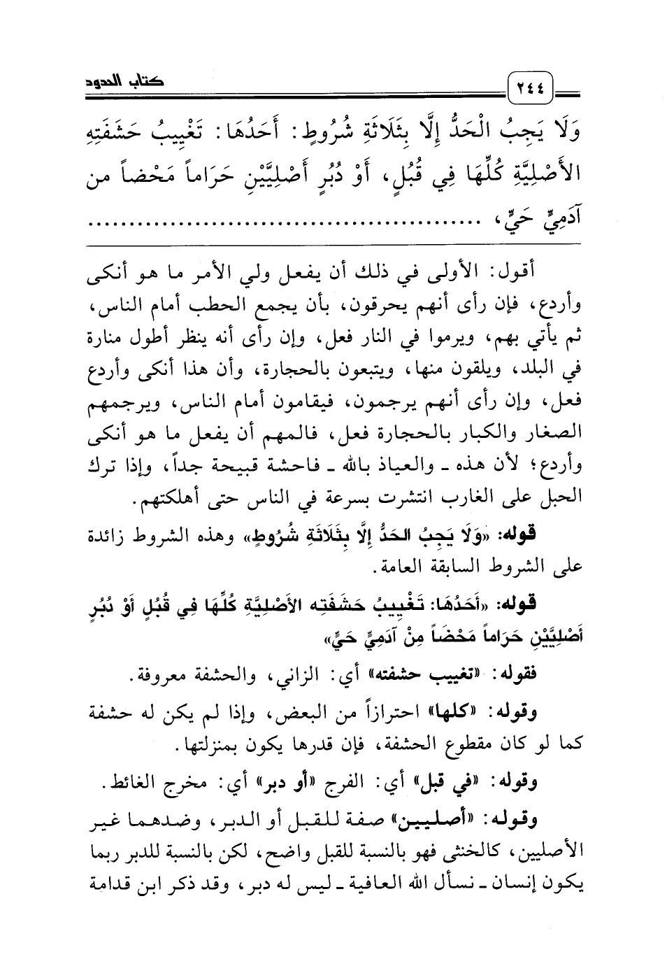 وَلاَ يَجِبُ الْحَدُّ إِلاَّ بِثَلاَثَةِ شُرُوطٍ: أَحَدُهَا: تَغْيِيبُ حَشَفَتِهِ الأَصْلِيَّةِ كُلِّهَا فِي قُبُلٍ، أَوْ دُبُرٍ أَصْلِيَّيْنِ حَرَاماً مَحْضاً من آدَمِيٍّ حَيٍّ، ..............