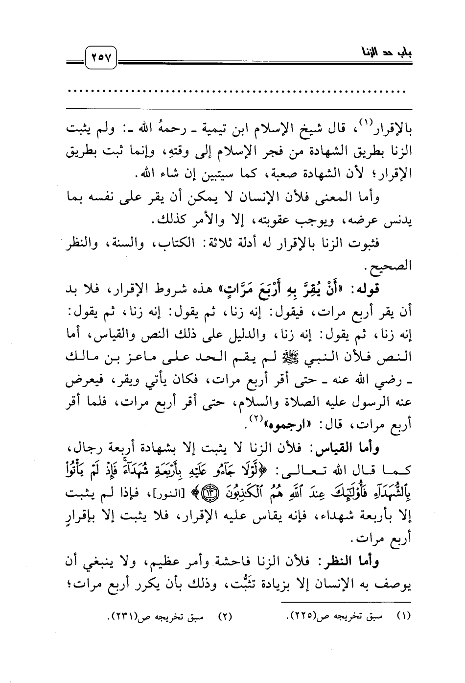 بالإقرار (¬1)، قال شيخ الإسلام ابن تيمية ـ رحمه الله ـ: ولم يثبت الزنا بطريق الشهادة من فجر الإسلام إلى وقتهِ، وإنما ثبت بطريق الإقرار؛ لأن الشهادة صعبة، كما سيتبين إن شاء الله.