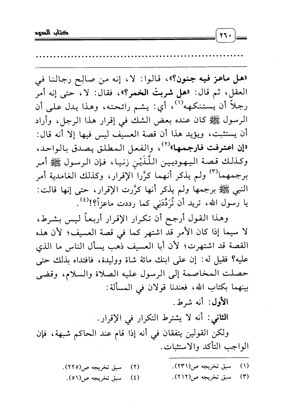 «هل ماعز فيه جنون؟»، قالوا: لا، إنه من صالِح رجالنا في العقل، ثم قال: «هل شربتَ الخمر؟»، فقال: لا، حتى إنه أمر رجلاً أن يستنكهه (¬1)، أي: يشم رائحته، وهذا يدل على أن الرسول صلّى الله عليه وسلّم كان عنده بعض الشك في إقرار هذا الرجل، وأراد أن يستثبت، ويؤيد هذا أن قصة العسيف ليس فيها إلا أنه قال: «إن اعترفت فارجمها» (¬2)، والفعل المطلق يصدق بالواحد، وكذلك قصة اليهوديين اللَّذَيْنِ زنيا، فإن الرسول صلّى الله عليه وسلّم أمر برجمهما (¬3) ولم يذكر أنهما كرَّرا الإقرار، وكذلك الغامدية أمر النبي صلّى الله عليه وسلّم برجمها ولم يذكر أنها كرَّرت الإقرار، حتى إنها قالت: يا رسول الله، تريد أن تُرَدِّدَنِي كما رددت ماعزاً؟! (¬4).