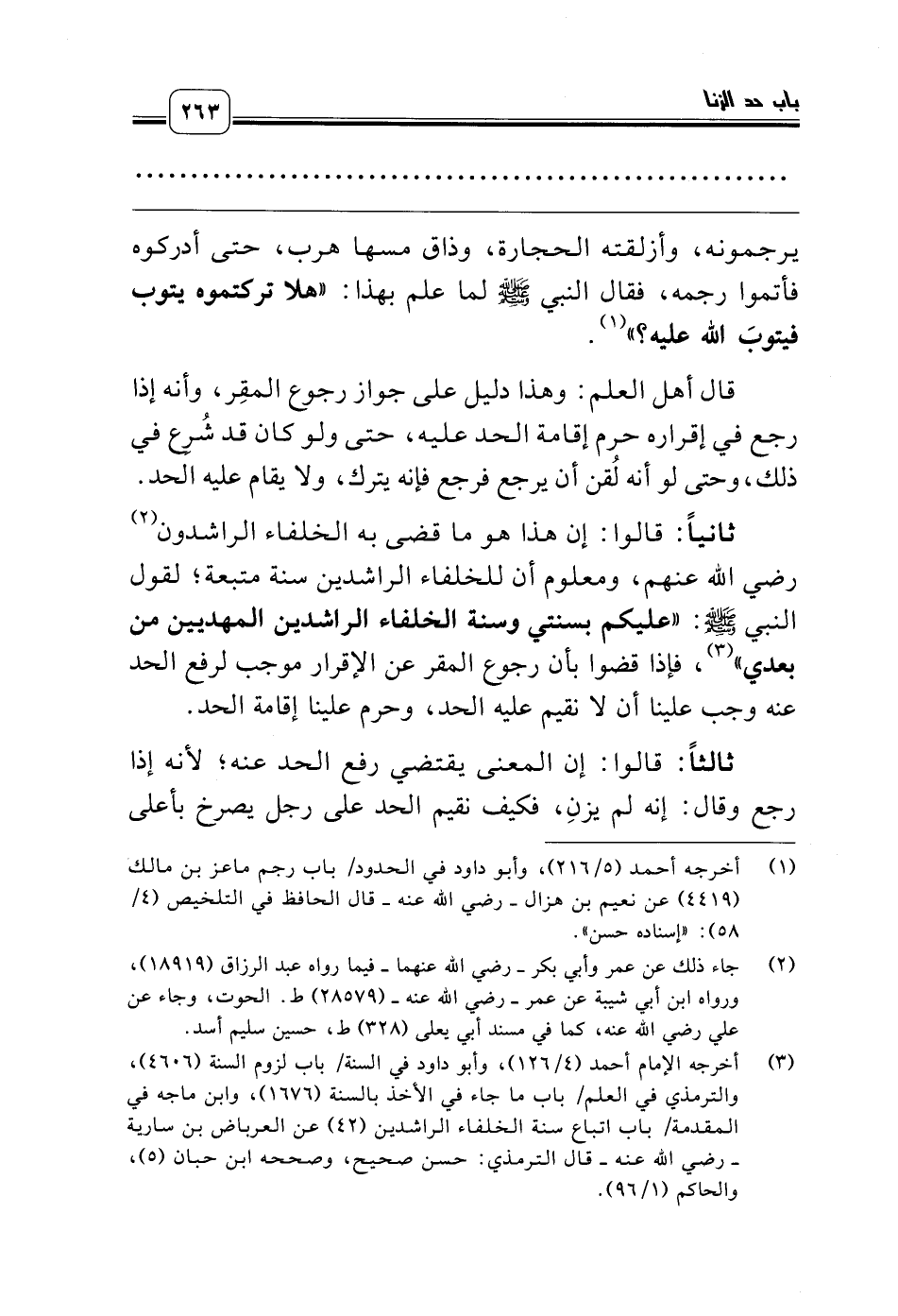 ثانياً: قالوا: إن هذا هو ما قضى به الخلفاء الراشدون (¬2) رضي الله عنهم، ومعلوم أن للخلفاء الراشدين سنة متبعة؛ لقول النبي صلّى الله عليه وسلّم: «عليكم بسنتي وسنة الخلفاء الراشدين المهديين من بعدي» (¬3)، فإذا قضوا بأن رجوع المقر عن الإقرار موجب لرفع الحد عنه وجب علينا أن لا نقيم عليه الحد، وحرم علينا إقامة الحد.