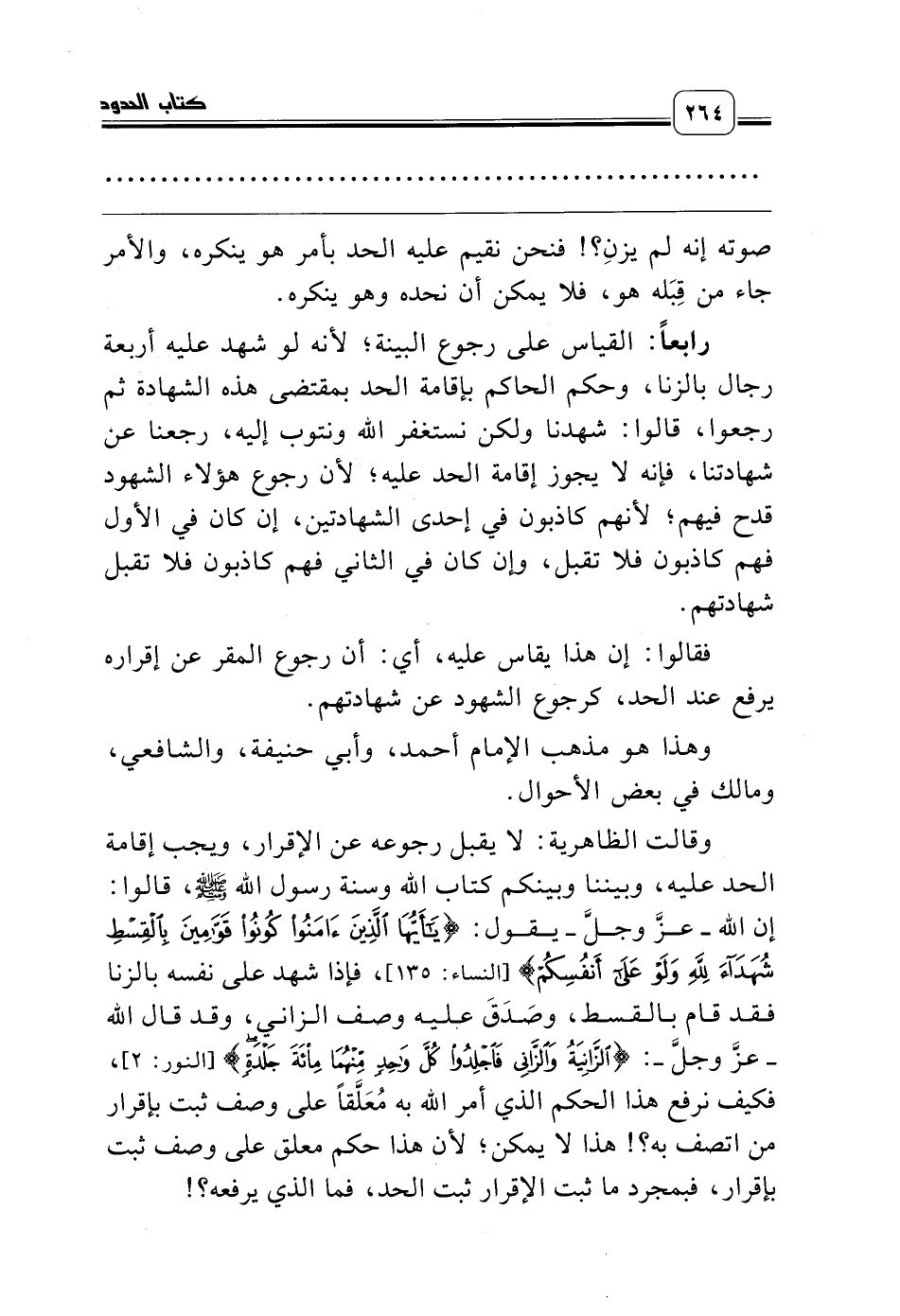 وقالت الظاهرية: لا يقبل رجوعه عن الإقرار، ويجب إقامة الحد عليه، وبيننا وبينكم كتاب الله وسنة رسول الله صلّى الله عليه وسلّم، قالوا: إن الله ـ عزّ وجل ـ يقول: {يَاأَيُّهَا الَّذِينَ آمَنُوا كُونُوا قَوَّامِينَ بِالْقِسْطِ شُهَدَاءَ لِلَّهِ وَلَوْ عَلَى أَنْفُسِكُمْ} [النساء: 135]، فإذا شهد على نفسه بالزنا فقد قام بالقسط، وصَدَقَ عليه وصف الزاني، وقد قال الله ـ عزّ وجل ـ: {الزَّانِيَةُ وَالزَّانِي فَاجْلِدُوا كُلَّ وَاحِدٍ مِنْهُمَا مِئَةَ جَلْدَةٍ} [النور: 2]، فكيف نرفع هذا الحكم الذي أمر الله به مُعَلَّقاً على وصف ثبت بإقرار من اتصف به؟! هذا لا يمكن؛ لأن هذا حكم معلق على وصف ثبت بإقرار، فبمجرد ما ثبت الإقرار ثبت الحد، فما الذي يرفعه؟!