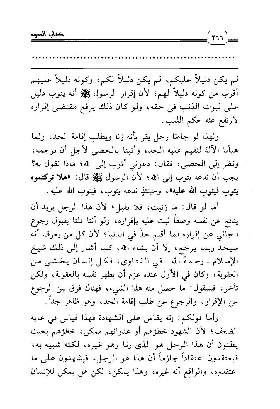 ولهذا لو جاءنا رجل يقر بأنه زنا ويطلب إقامة الحد، ولما هيأنا الآلة لنقيم عليه الحد، وأتينا بالحصى لأجل أن نرجمه، ونظر إلى الحصى، فقال: دعوني أتوب إلى الله؛ ماذا نقول له؟ يجب أن ندعه يتوب إلى الله؛ لأن الرسول صلّى الله عليه وسلّم قال: «هلا تركتموه يتوب فيتوب الله عليه»، وحينئذٍ ندعه يتوب، فيتوب الله عليه.