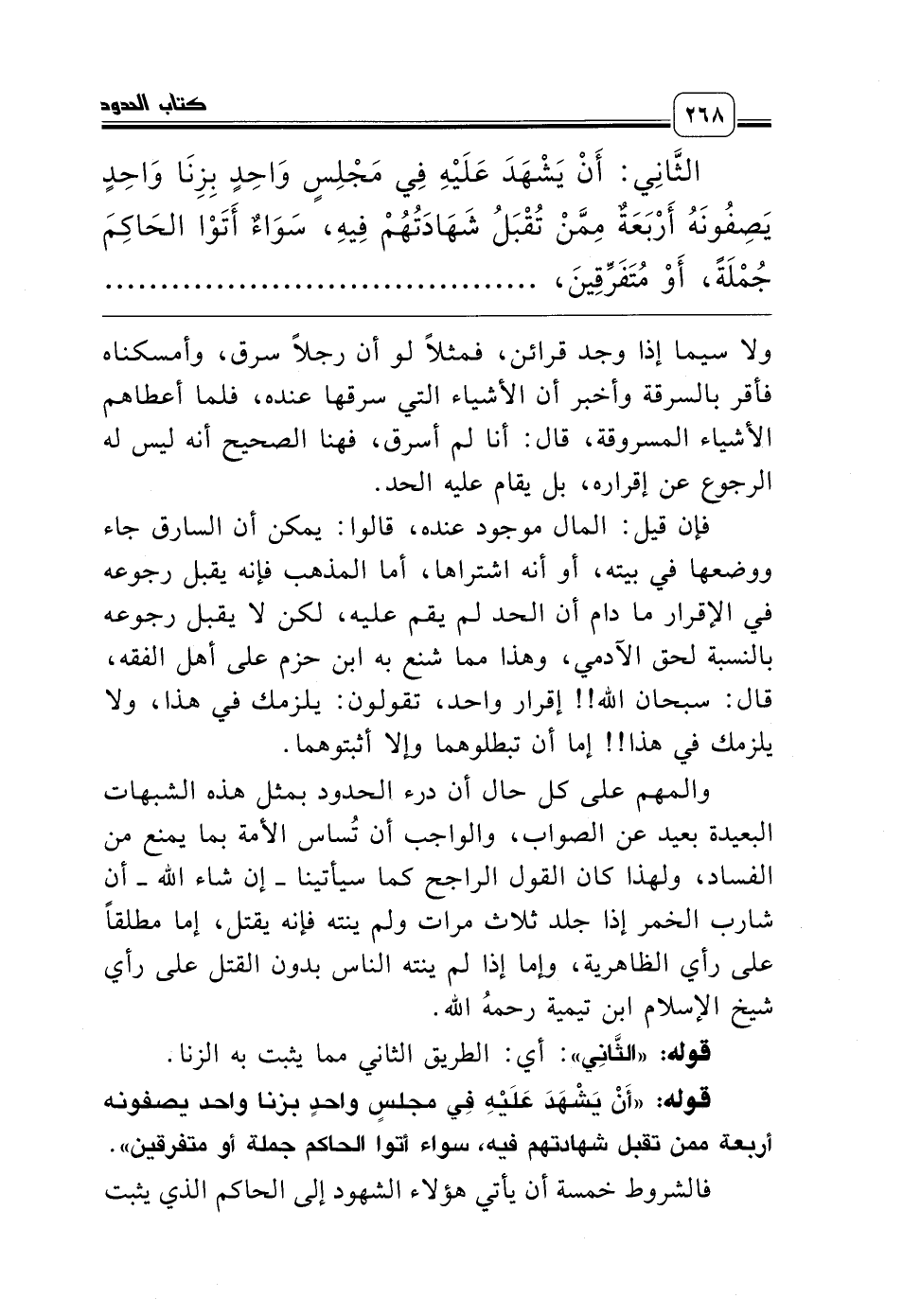 قوله: «أَنْ يَشْهَدَ عَلَيْهِ فِي مجلسٍ واحدٍ بزنا واحد يصفونه أربعة ممن تقبل شهادتهم فيه، سواء أتوا الحاكم جملة أو متفرقين».