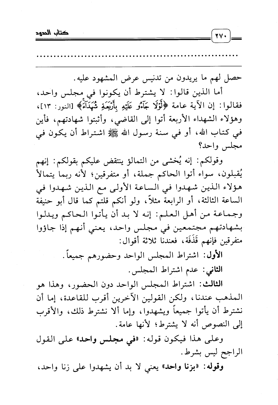أما الذين قالوا: لا يشترط أن يكونوا في مجلس واحد، فقالوا: إن الآية عامة {لَوْلاَ جَاءُوا عَلَيْهِ بِأَرْبَعَةِ شُهَدَاءَ} [النور: 13]، وهؤلاء الشهداء الأربعة أتوا إلى القاضي، وأثبتوا شهادتهم، فأين في كتاب الله، أو في سنة رسول الله صلّى الله عليه وسلّم اشتراط أن يكون في مجلس واحد؟
