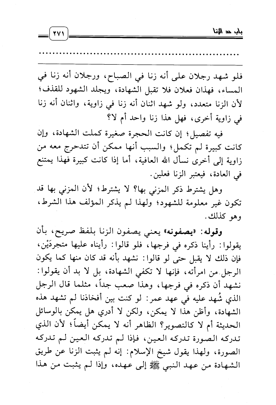 وقوله: «يصفونه» يعني يصفون الزنا بلفظ صريح، بأن يقولوا: رأينا ذكره في فرجها، فلو قالوا: رأيناه عليها متجردَيْن، فإن ذلك لا يقبل حتى لو قالوا: نشهد بأنه قد كان منها كما يكون الرجل من امرأته، فإنها لا تكفي الشهادة، بل لا بد أن يقولوا: نشهد أن ذكره في فرجها، وهذا صعب جداً، مثلما قال الرجل الذي شُهد عليه في عهد عمر: لو كنت بين أفخاذنا لم تشهد هذه الشهادة، وأظن هذا لا يمكن، ولكن لا أدري هل يمكن بالوسائل الحديثة أم لا كالتصوير؟ الظاهر أنه لا يمكن أيضاً؛ لأن الذي تدركه الصورة تدركه العين، فإذا لم تدركه العين لم تدركه الصورة، ولهذا يقول شيخ الإسلام: إنه لم يثبت الزنا عن طريق الشهادة من عهد النبي صلّى الله عليه وسلّم إلى عهده، وإذا لم يثبت من هذا