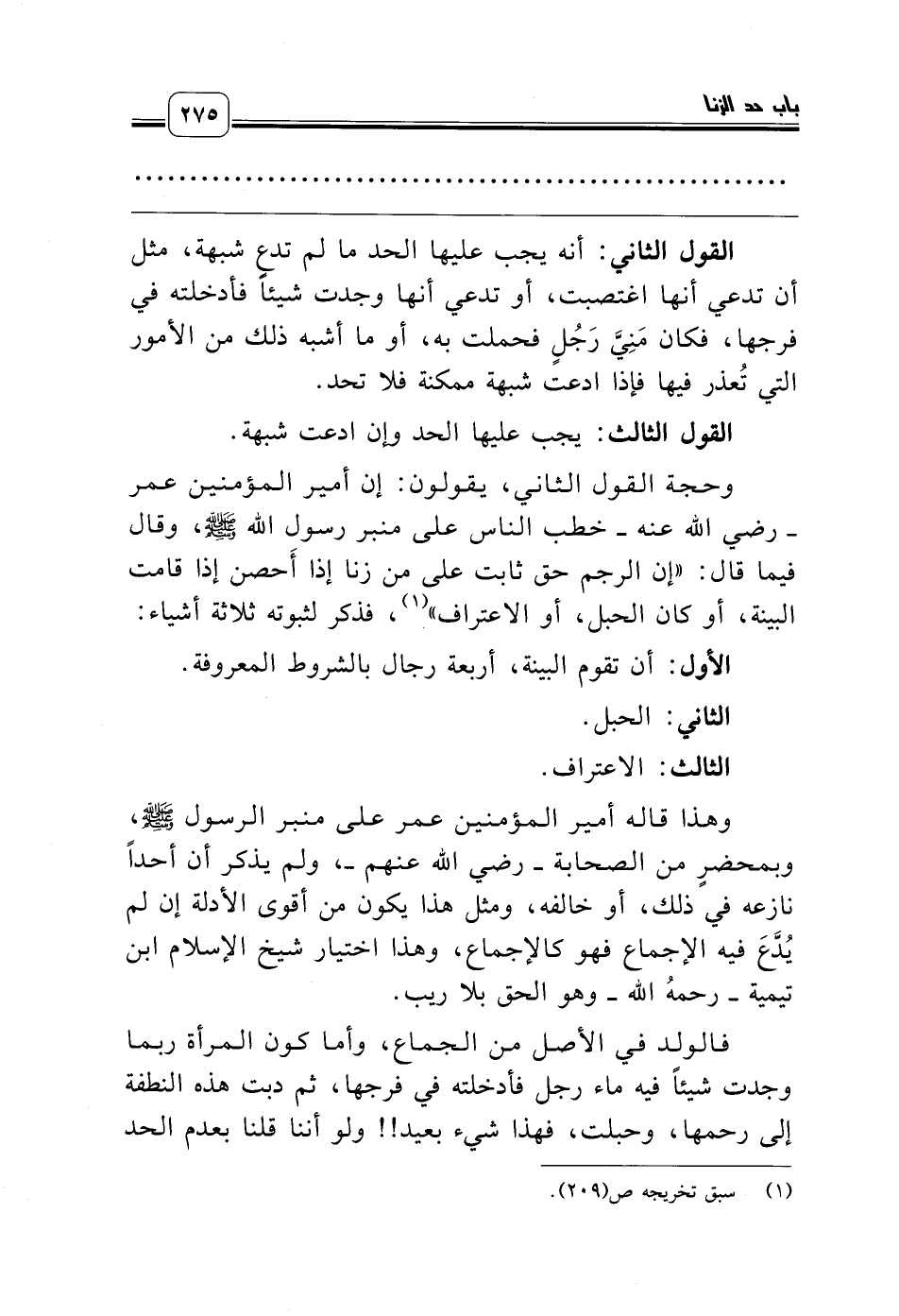 وحجة القول الثاني، يقولون: إن أمير المؤمنين عمر ـ رضي الله عنه ـ خطب الناس على منبر رسول الله صلّى الله عليه وسلّم، وقال فيما قال: «إن الرجم حق ثابت على من زنا إذا أَحصن إذا قامت البينة، أو كان الحبل، أو الاعتراف» (¬1)، فذكر لثبوته ثلاثة أشياء:
