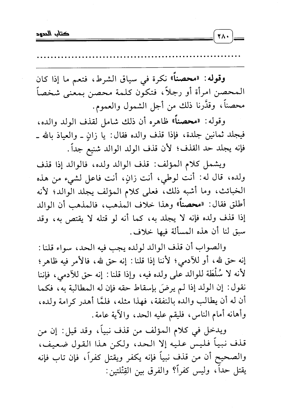 وقوله: «محصناً» ظاهره أن ذلك شامل لقذف الولد والده، فيجلد ثمانين جلدة، فإذا قذف والده فقال: يا زانٍ ـ والعياذ بالله ـ فإنه يجلد حد القذف؛ لأن قذف الولد الوالد شنيع جداً.