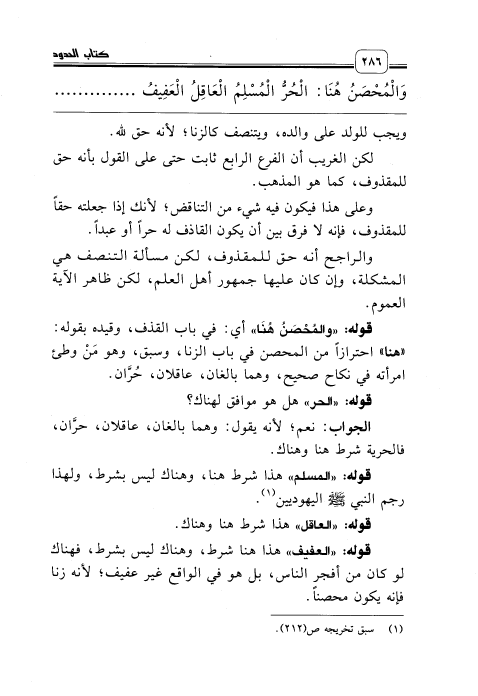 قوله: «العفيف» هذا هنا شرط، وهناك ليس بشرط، فهناك لو كان من أفجر الناس، بل هو في الواقع غير عفيف؛ لأنه زنا فإنه يكون محصناً.