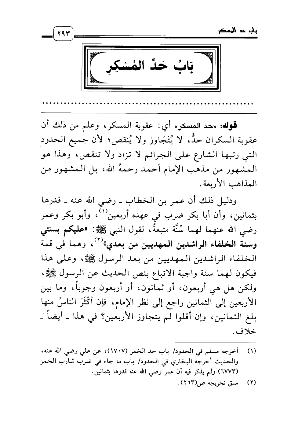 قوله: «حد المسكر» أي: عقوبة المسكر، وعلم من ذلك أن عقوبة السكران حدٌّ، لا يُتَجَاوز ولا يُنقص؛ لأن جميع الحدود التي رتبها الشارع على الجرائم لا تزاد ولا تنقص، وهذا هو المشهور من مذهب الإمام أحمد رحمه الله، بل المشهور من المذاهب الأربعة.