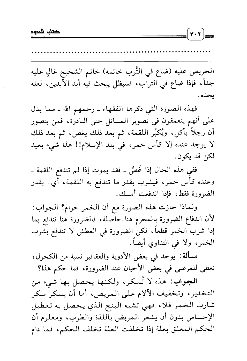 فهذه الصورة التي ذكرها الفقهاء ـ رحمهم الله ـ مما يدل على أنهم يتعمقون في تصوير المسائل حتى النادرة، فمن يتصور أن رجلاً يأكل، ويُكبِّر اللقمة، ثم بعد ذلك يغص، ثم بعد ذلك لا يوجد عنده إلا كأس خمر، في بلد الإسلام!! هذا شيء بعيد لكن قد يكون.
