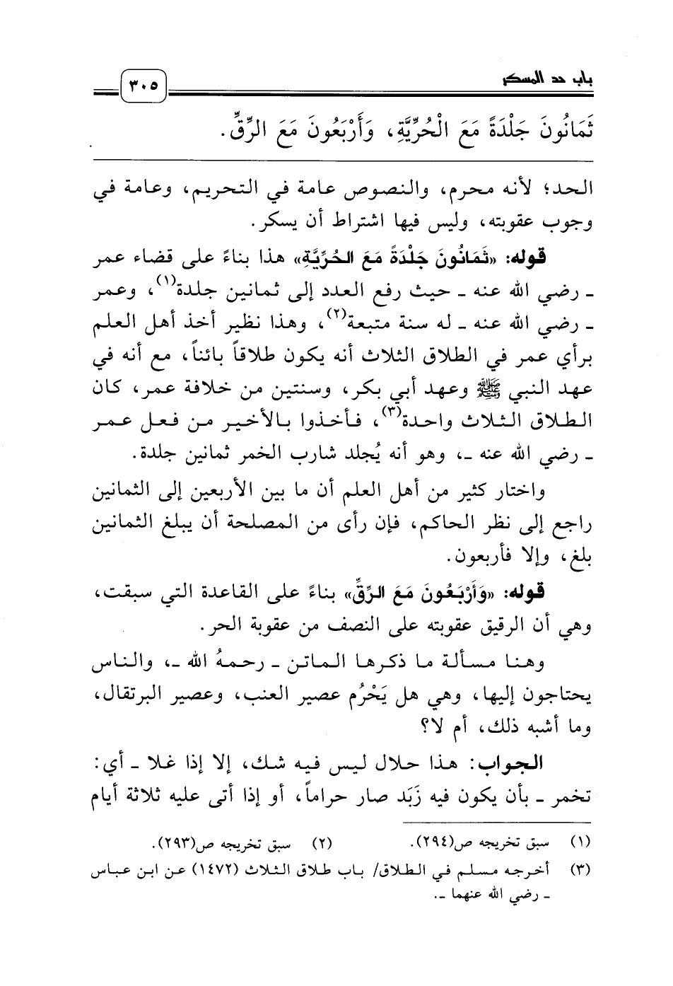 قوله: «ثَمَانُونَ جَلْدَةً مَعَ الحُرِّيَّةِ» هذا بناءً على قضاء عمر ـ رضي الله عنه ـ حيث رفع العدد إلى ثمانين جلدة (¬1)، وعمر ـ رضي الله عنه ـ له سنة متبعة (¬2)، وهذا نظير أخذ أهل العلم برأي عمر في الطلاق الثلاث أنه يكون طلاقاً بائناً، مع أنه في عهد النبي صلّى الله عليه وسلّم وعهد أبي بكر، وسنتين من خلافة عمر، كان الطلاق الثلاث واحدة (¬3)، فأخذوا بالأخير من فعل عمر ـ رضي الله عنه ـ، وهو أنه يُجلد شارب الخمر ثمانين جلدة.