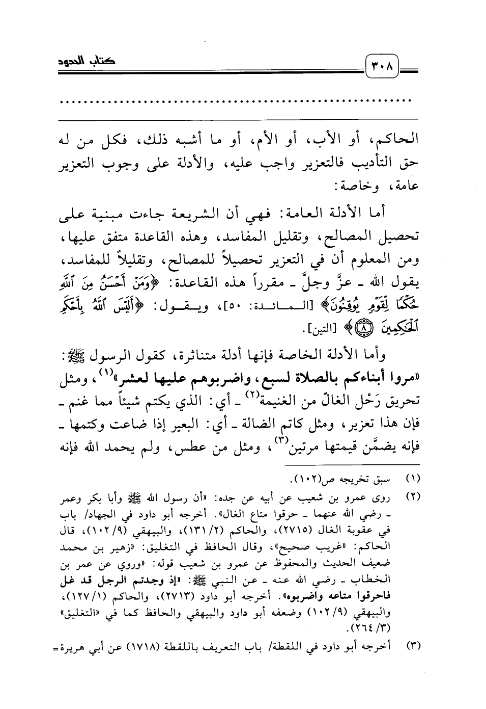 وأما الأدلة الخاصة فإنها أدلة متناثرة، كقول الرسول صلّى الله عليه وسلّم: «مروا أبناءكم بالصلاة لسبع، واضربوهم عليها لعشر» (¬1)، ومثل تحريق رَحْل الغالّ من الغنيمة (¬2) ـ أي: الذي يكتم شيئاً مما غنم ـ فإن هذا تعزير، ومثل كاتم الضالة ـ أي: البعير إذا ضاعت وكتمها ـ فإنه يضمَّن قيمتها مرتين (¬3)، ومثل من عطس، ولم يحمد الله فإنه