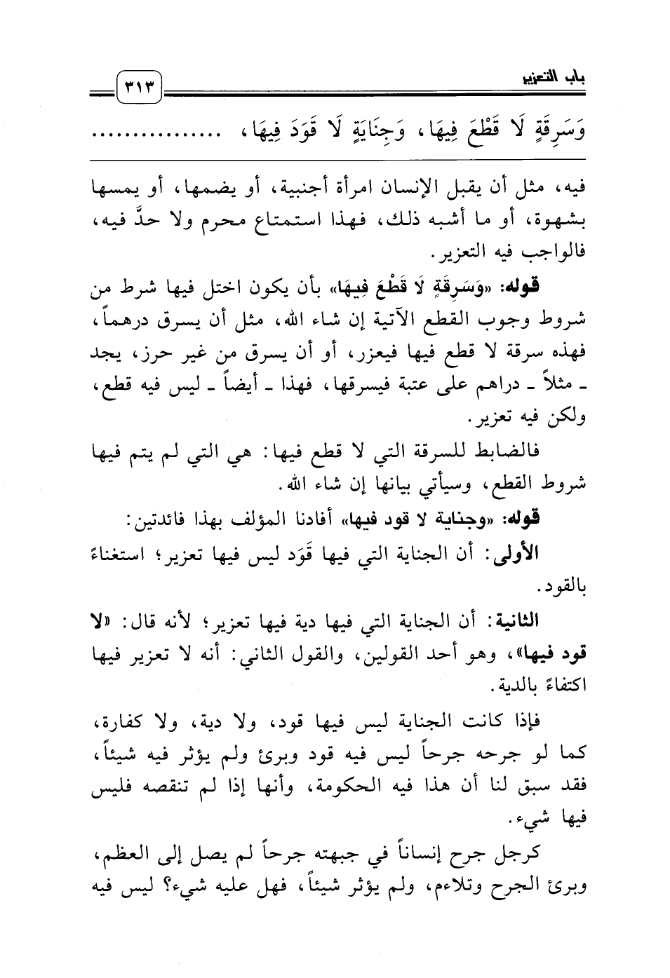 قوله: «وَسَرِقَةٍ لاَ قَطْعَ فِيهَا» بأن يكون اختل فيها شرط من شروط وجوب القطع الآتية إن شاء الله، مثل أن يسرق درهماً، فهذه سرقة لا قطع فيها فيعزر، أو أن يسرق من غير حرز، يجد ـ مثلاً ـ دراهم على عتبة فيسرقها، فهذا ـ أيضاً ـ ليس فيه قطع، ولكن فيه تعزير.