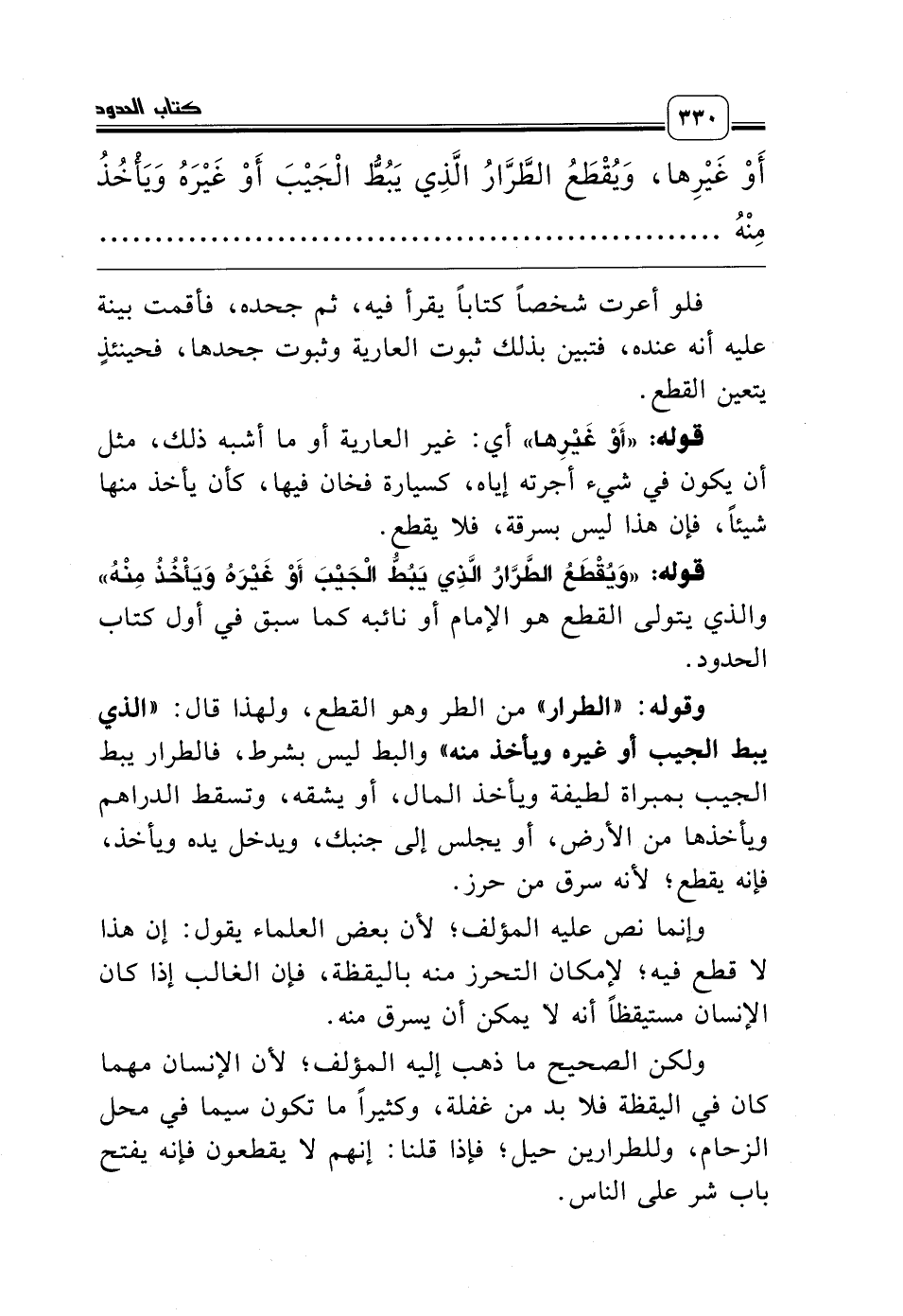 َوْ غَيْرِها، وَيُقْطَعُ الطَّرَّارُ الَّذِي يَبُطُّ الْجَيْبَ أَوْ غَيْرَهُ وَيَأْخُذُ مِنْهُ وَيُشْتَرَطُ أَنْ يَكُونَ الْمَسْرُوقُ مَالاً مُحْتَرَماً، ..