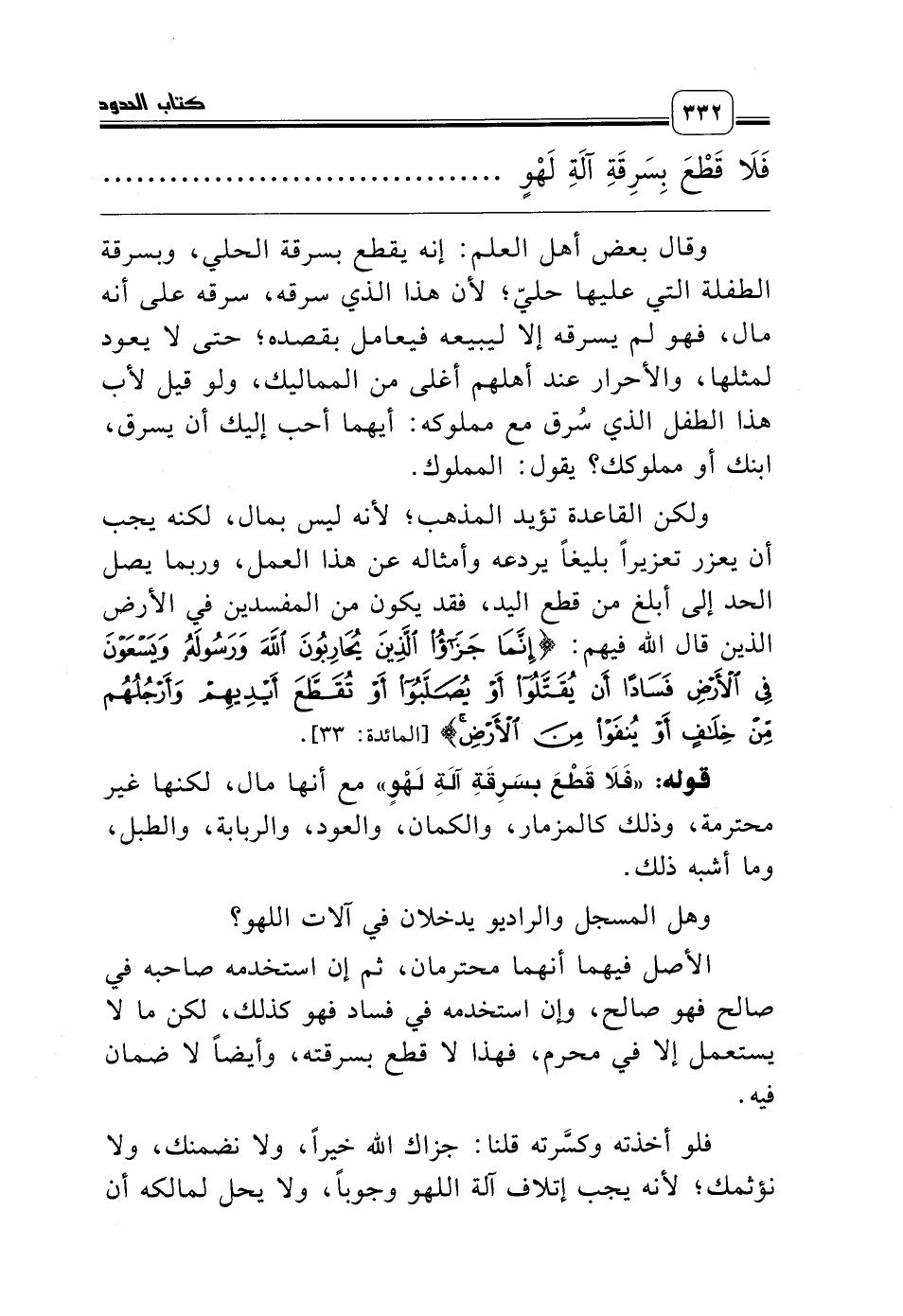 قوله: «فَلاَ قَطْعَ بسَرِقَةِ آلَةِ لَهْوٍ» مع أنها مال، لكنها غير محترمة، وذلك كالمزمار، والكمان، والعود، والربابة، والطبل، وما أشبه ذلك.