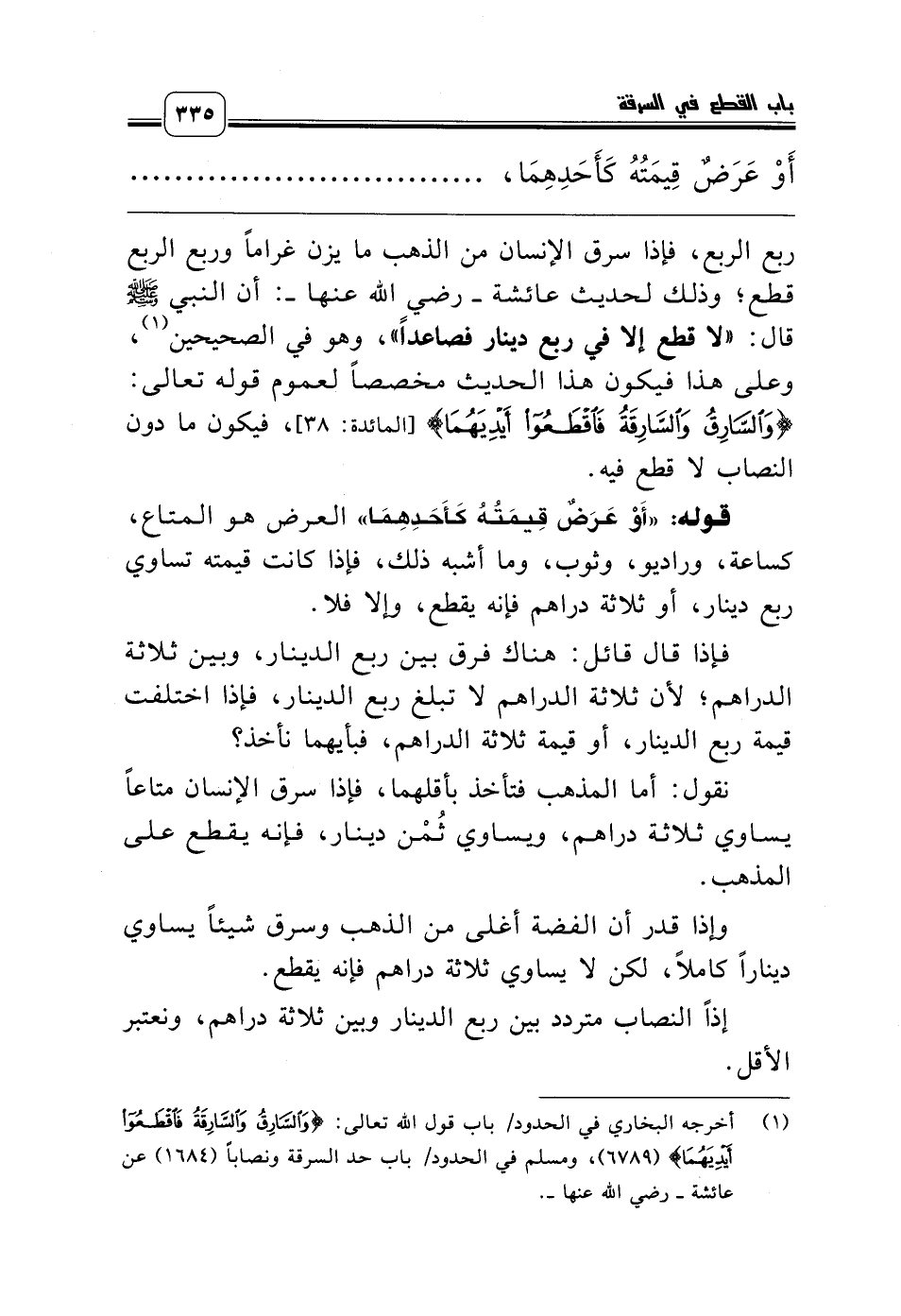 قوله: «أَوْ عَرَضٌ قِيمَتُهُ كَأَحَدِهِمَا» العرض هو المتاع، كساعة، وراديو، وثوب، وما أشبه ذلك، فإذا كانت قيمته تساوي ربع دينار، أو ثلاثة دراهم فإنه يقطع، وإلا فلا.