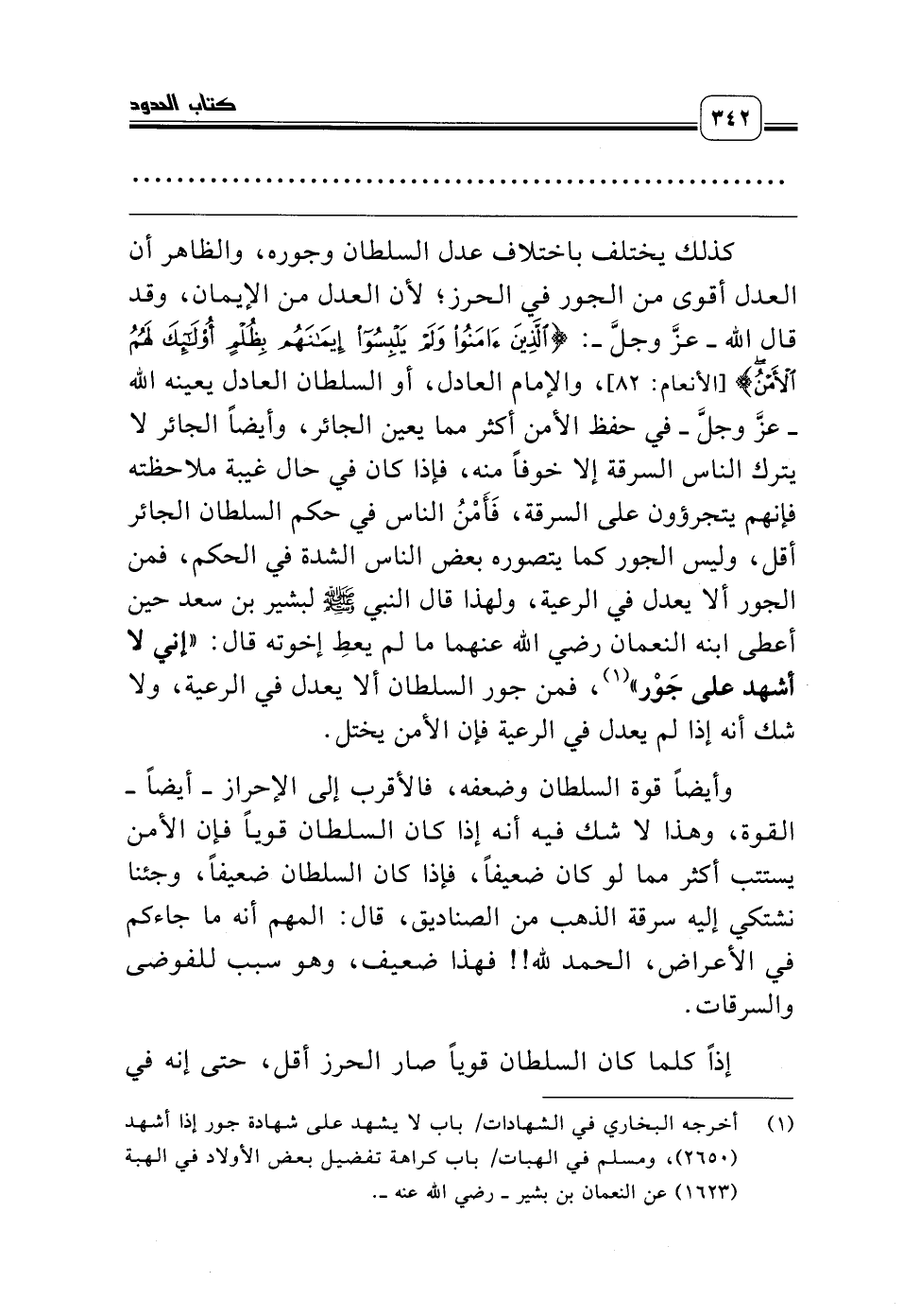 كذلك يختلف باختلاف عدل السلطان وجوره، والظاهر أن العدل أقوى من الجور في الحرز؛ لأن العدل من الإيمان، وقد قال الله ـ عزّ وجل ـ: {الَّذِينَ آمَنُوا وَلَمْ يَلْبِسُوا إِيمَانَهُمْ بِظُلْمٍ أُولَئِكَ لَهُمُ الأَمْنُ} [الأنعام: 82]، والإمام العادل، أو السلطان العادل يعينه الله ـ عزّ وجل ـ في حفظ الأمن أكثر مما يعين الجائر، وأيضاً الجائر لا يترك الناس السرقة إلا خوفاً منه، فإذا كان في حال غيبة ملاحظته فإنهم يتجرؤون على السرقة، فَأَمْنُ الناس في حكم السلطان الجائر أقل، وليس الجور كما يتصوره بعض الناس الشدة في الحكم، فمن الجور ألا يعدل في الرعية، ولهذا قال النبي صلّى الله عليه وسلّم لبشير بن سعد حين أعطى ابنه النعمان رضي الله عنهما ما لم يعطِ إخوته قال: «إني لا أشهد على جَوْر» (¬1)، فمن جور السلطان ألا يعدل في الرعية، ولا شك أنه إذا لم يعدل في الرعية فإن الأمن يختل.