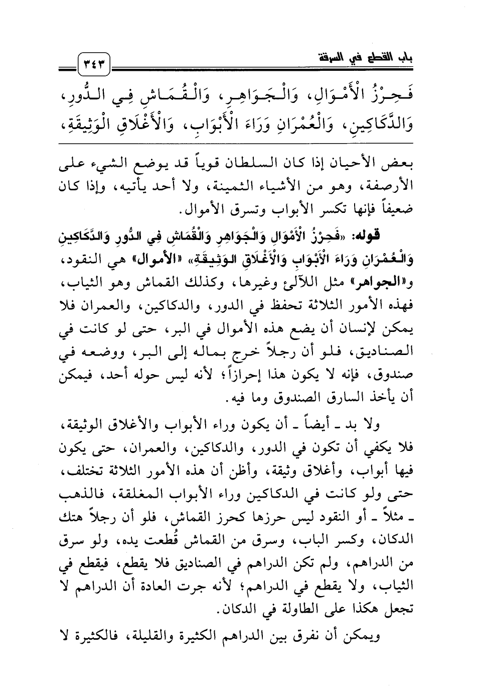 قوله: «فَحِرْزُ الأَْمْوَالِ وَالْجَوَاهِرِ وَالْقُمَاشِ فِي الدُّورِ وَالدَّكَاكِينِ وَالْعُمْرَانِ وَرَاءَ الأَْبْوَابِ وَالأَْغْلاَقِ الوَثِيقَةِ» «الأموال» هي النقود، و «الجواهر» مثل اللآلئ وغيرها، وكذلك القماش وهو الثياب، فهذه الأمور الثلاثة تحفظ في الدور، والدكاكين، والعمران فلا يمكن لإنسان أن يضع هذه الأموال في البر، حتى لو كانت في الصناديق، فلو أن رجلاً خرج بماله إلى البر، ووضعه في صندوق، فإنه لا يكون هذا إحرازاً؛ لأنه ليس حوله أحد، فيمكن أن يأخذ السارق الصندوق وما فيه.