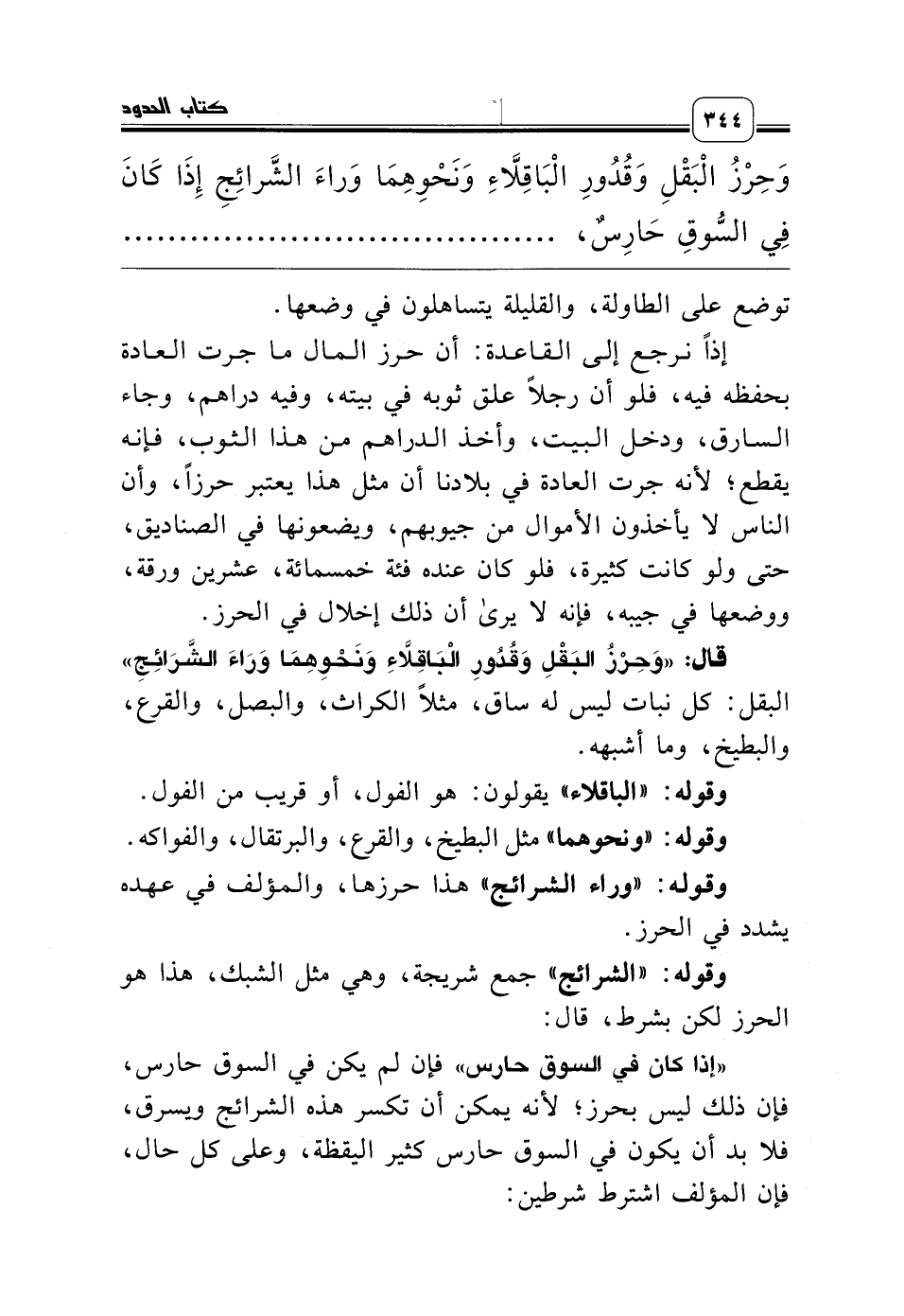قال: «وَحِرْزُ البَقْلِ وَقُدُورِ الْبَاقِلاَّءِ وَنَحْوِهِمَا وَرَاءَ الشَّرَائِجِ» البقل: كل نبات ليس له ساق، مثلاً الكراث، والبصل، والقرع، والبطيخ، وما أشبهه.