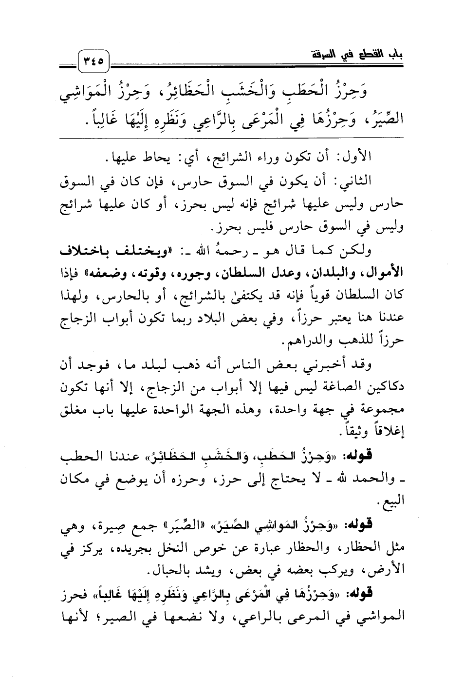 ولكن كما قال هو ـ رحمه الله ـ: «ويختلف باختلاف الأموال، والبلدان، وعدل السلطان، وجوره، وقوته، وضعفه» فإذا كان السلطان قوياً فإنه قد يكتفى بالشرائج، أو بالحارس، ولهذا عندنا هنا يعتبر حرزاً، وفي بعض البلاد ربما تكون أبواب الزجاج حرزاً للذهب والدراهم.