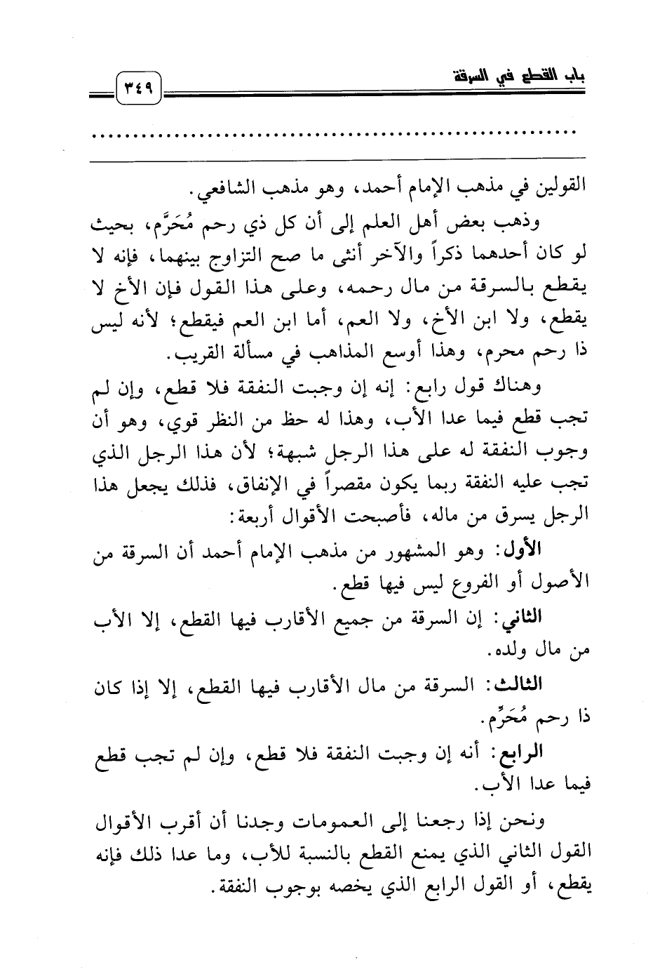 وهناك قول رابع: إنه إن وجبت النفقة فلا قطع، وإن لم تجب قطع فيما عدا الأب، وهذا له حظ من النظر قوي، وهو أن وجوب النفقة له على هذا الرجل شبهة؛ لأن هذا الرجل الذي تجب عليه النفقة ربما يكون مقصراً في الإنفاق، فذلك يجعل هذا الرجل يسرق من ماله، فأصبحت الأقوال أربعة: