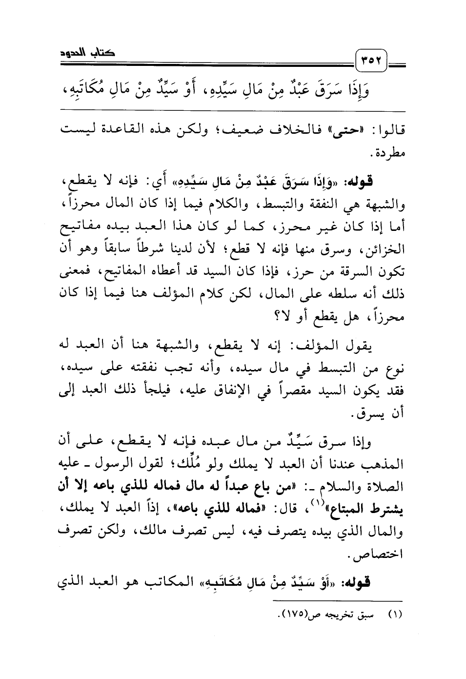 وإذا سرق سَيِّدٌ من مال عبده فإنه لا يقطع، على أن المذهب عندنا أن العبد لا يملك ولو مُلِّك؛ لقول الرسول ـ عليه الصلاة والسلام ـ: «من باع عبداً له مال فماله للذي باعه إلا أن يشترط المبتاع» (¬1)، قال: «فماله للذي باعه»، إذاً العبد لا يملك، والمال الذي بيده يتصرف فيه، ليس تصرف مالك، ولكن تصرف اختصاص.