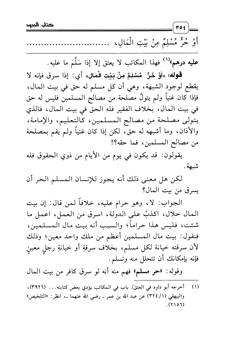 قوله: «أَوْ حُرٌّ مُسْلِمٌ مِنْ بَيْتِ الْمَالِ» أي: إذا سرق فإنه لا يقطع لوجود الشبهة، وهي أن كل مسلم له حق في بيت المال، فإذا كان غنياً ولم يتولَّ مصلحة من مصالح المسلمين فليس له حق في بيت المال، بخلاف الفقير فله الحق في بيت المال، فالذي يتولى مصلحة من مصالح المسلمين، كالتعليم، والإمامة، والأذان، وما أشبهه له حق، لكن إذا كان غنياً ولم يقم بمصلحة من مصالح المسلمين، فما حقه؟!