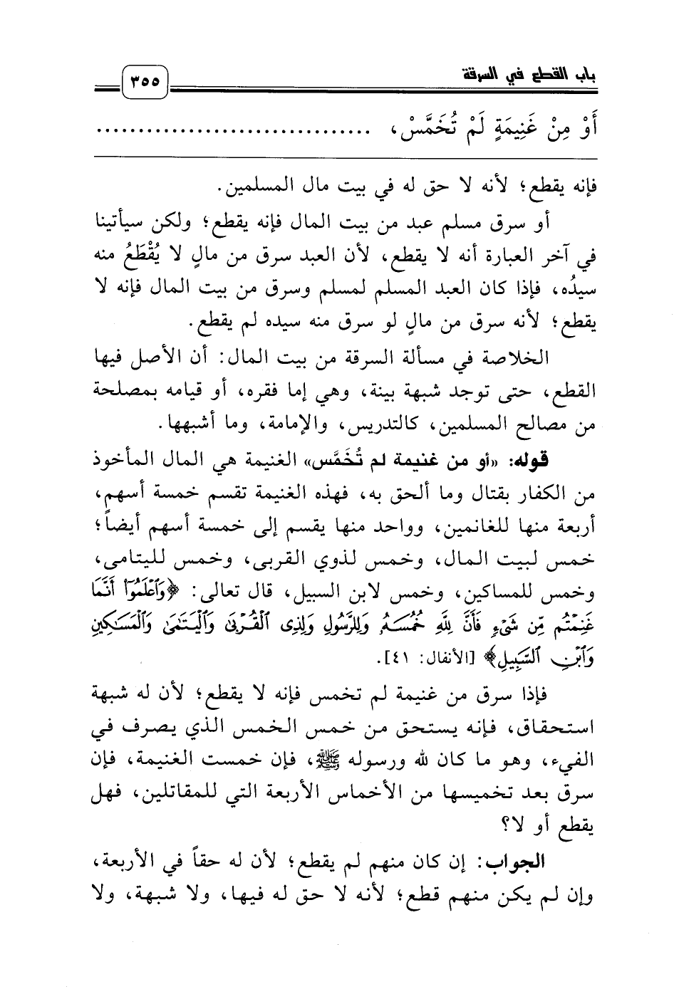 فإذا سرق من غنيمة لم تخمس فإنه لا يقطع؛ لأن له شبهة استحقاق، فإنه يستحق من خمس الخمس الذي يصرف في الفيء، وهو ما كان لله ورسوله صلّى الله عليه وسلّم، فإن خمست الغنيمة، فإن سرق بعد تخميسها من الأخماس الأربعة التي للمقاتلين، فهل يقطع أو لا؟