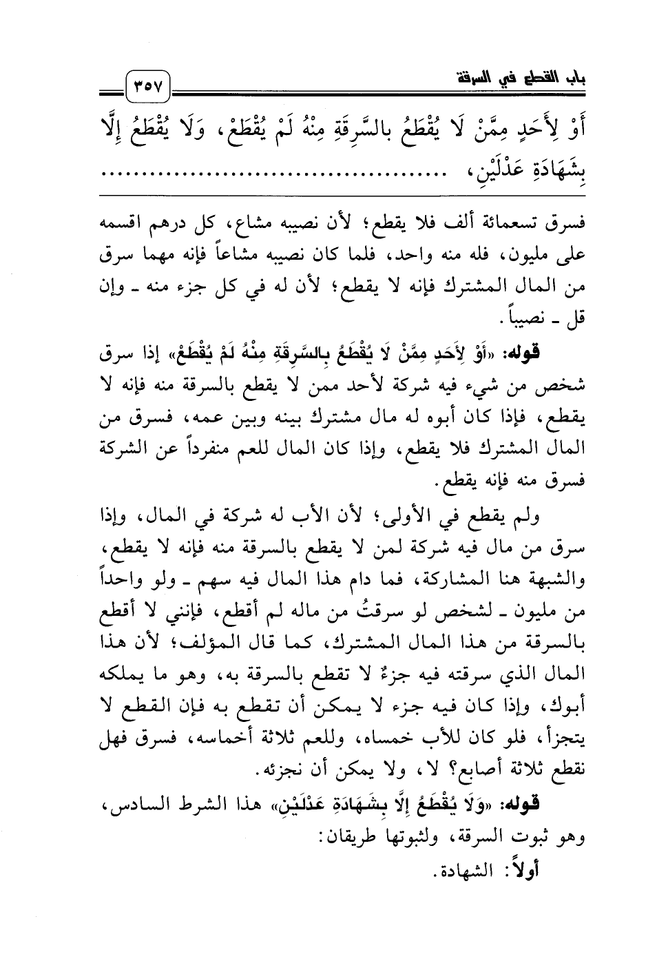 قوله: «وَلاَ يُقْطَعُ إِلاَّ بِشَهَادَةِ عَدْلَيْنِ» هذا الشرط السادس، وهو ثبوت السرقة، ولثبوتها طريقان: