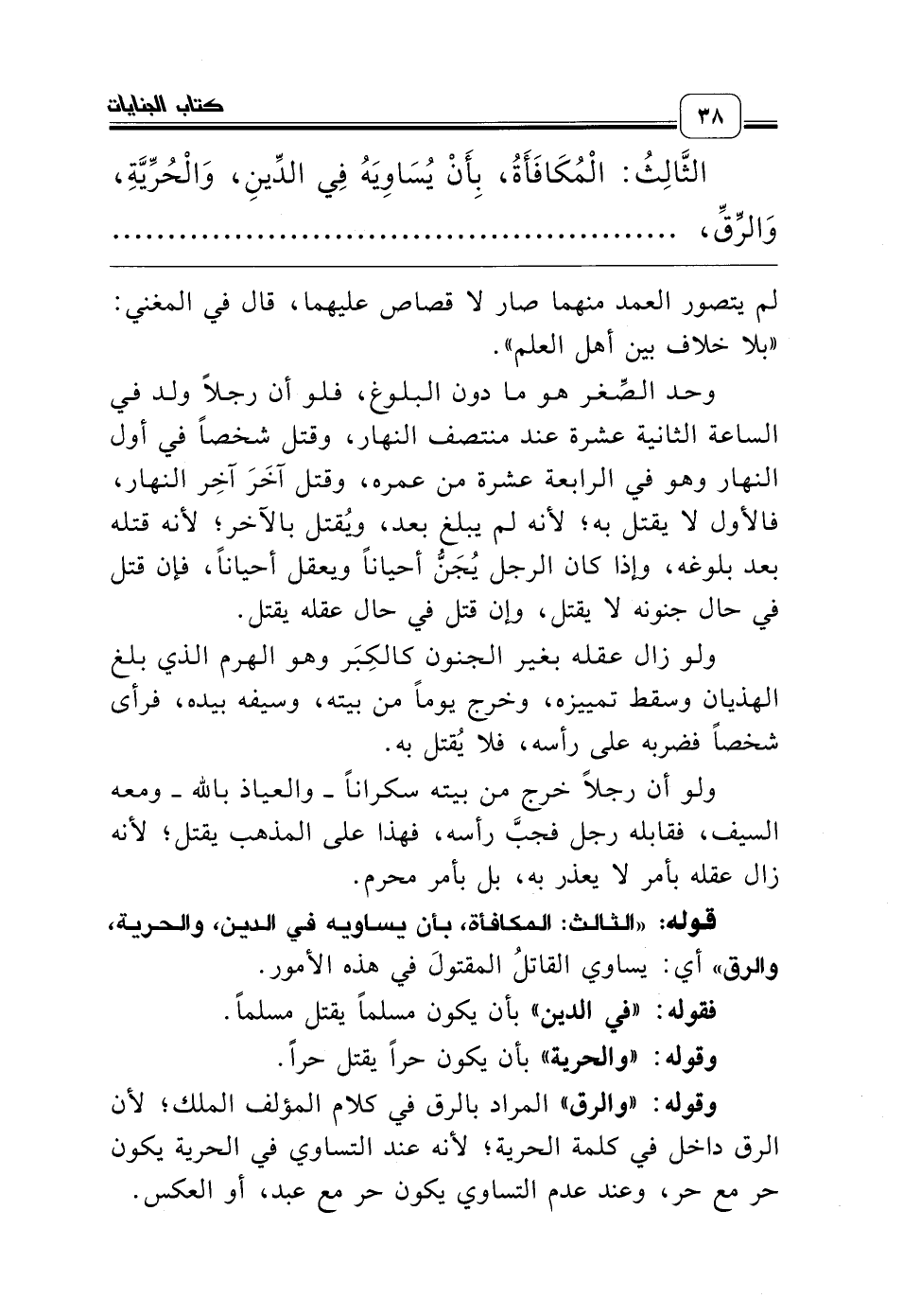 قوله: «الثالث: المكافأة، بأن يساويه في الدين، والحرية، والرق» أي: يساوي القاتلُ المقتولَ في هذه الأمور.