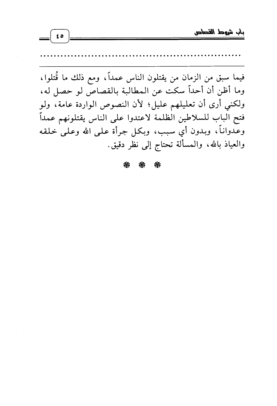 فيما سبق من الزمان من يقتلون الناس عمداً، ومع ذلك ما قُتلوا، وما أظن أن أحداً سكت عن المطالبة بالقصاص لو حصل له، ولكني أرى أن تعليلهم عليل؛ لأن النصوص الواردة عامة، ولو فتح الباب للسلاطين الظلمة لاعتدوا على الناس يقتلونهم عمداً وعدواناً، وبدون أي سبب، وبكل جرأة على الله وعلى خلقه والعياذ بالله، والمسألة تحتاج إلى نظر دقيق.