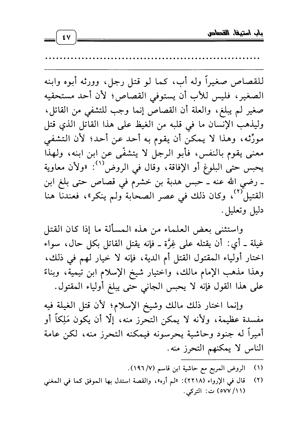 للقصاص صغيراً وله أب، كما لو قتل رجل، وورثه أبوه وابنه الصغير، فليس للأب أن يستوفي القصاص؛ لأن أحد مستحقيه صغير لم يبلغ، والعلة أن القصاص إنما وجب للتشفي من القاتل، وليذهب الإنسان ما في قلبه من الغيظ على هذا القاتل الذي قتل مورِّثه، وهذا لا يمكن أن يقوم به أحد عن أحد؛ لأن التشفي معنى يقوم بالنفس، فأبو الرجل لا يتشفّى عن ابن ابنه، ولهذا يحبس حتى البلوغ أو الإفاقة، وقال في الروض (¬1): «ولأن معاوية ـ رضي الله عنه ـ حبس هدبة بن خشرم في قصاص حتى بلغ ابن القتيل (¬2)، وكان ذلك في عصر الصحابة ولم ينكر»، فعندنا هنا دليل وتعليل.