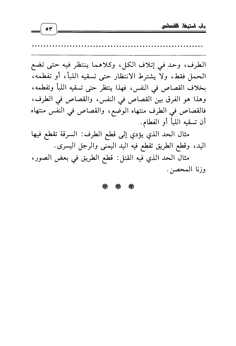 مثال الحد الذي يؤدي إلى قطع الطرف: السرقة تقطع فيها اليد، وقطع الطريق تقطع فيه اليد اليمنى والرجل اليسرى.