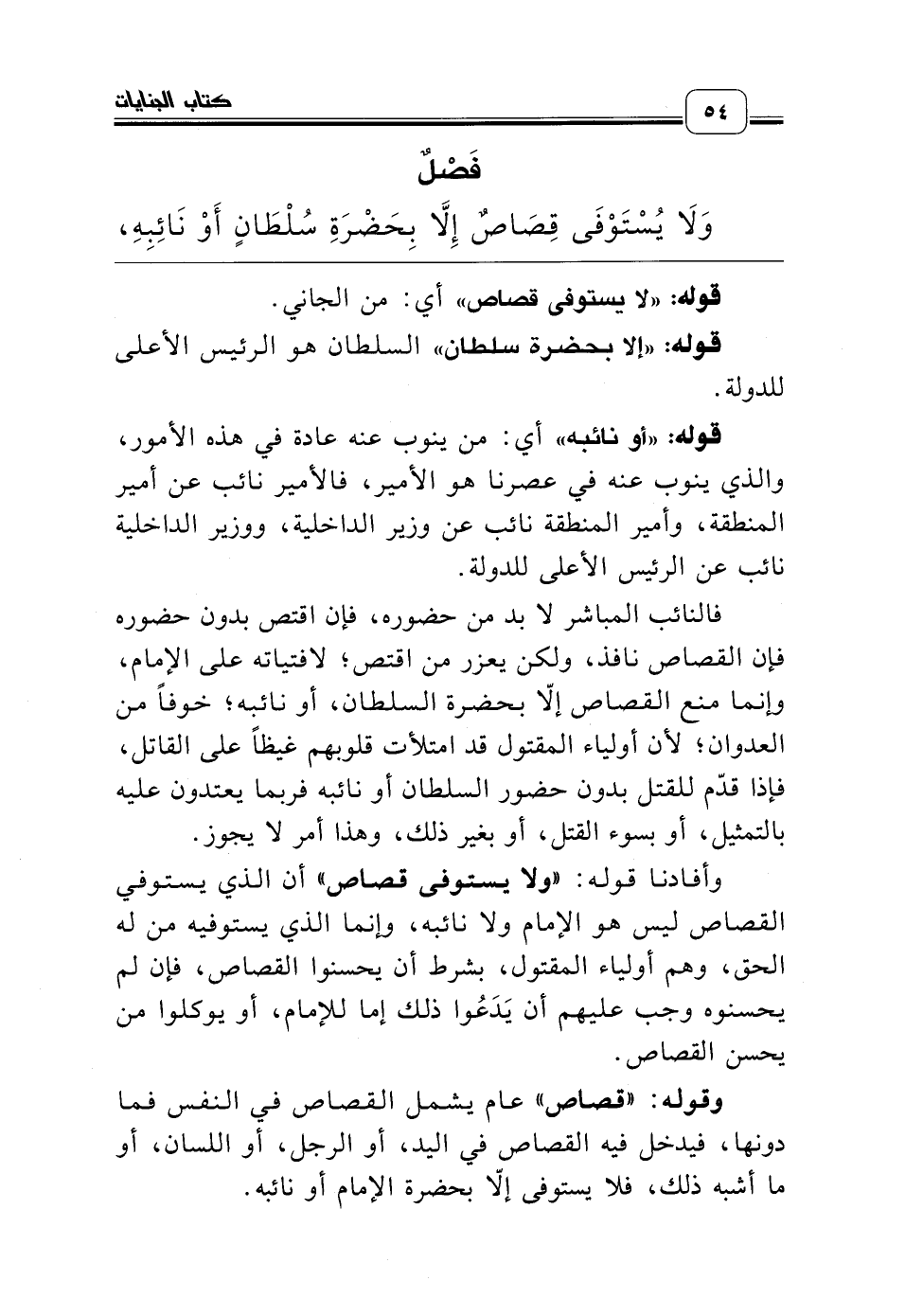 وقوله: «قصاص» عام يشمل القصاص في النفس فما دونها، فيدخل فيه القصاص في اليد، أو الرجل، أو اللسان، أو ما أشبه ذلك، فلا يستوفى إلاّ بحضرة الإمام أو نائبه.