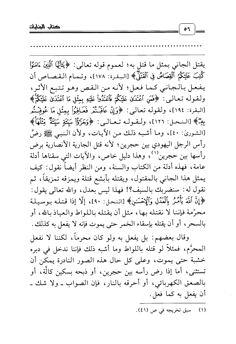 وقال بعضهم: بل يفعل به ولو كان محرماً، لكننا لا نفعل المحرَّم، فمثلاً لو قتله باللواط وما أشبه ذلك فإننا ندخل في دبره خشبة حتى يموت، وعلى كل حال هذه الصور النادرة يمكن أن تستثنى، أما إذا رض رأسه بين حجرين، أو ذبحه بسكين كالَّة، أو بالصعق الكهربائي، أو أحرقه بالنار، فإن الصواب ـ ولا شك ـ أن يفعل به كما فعل.